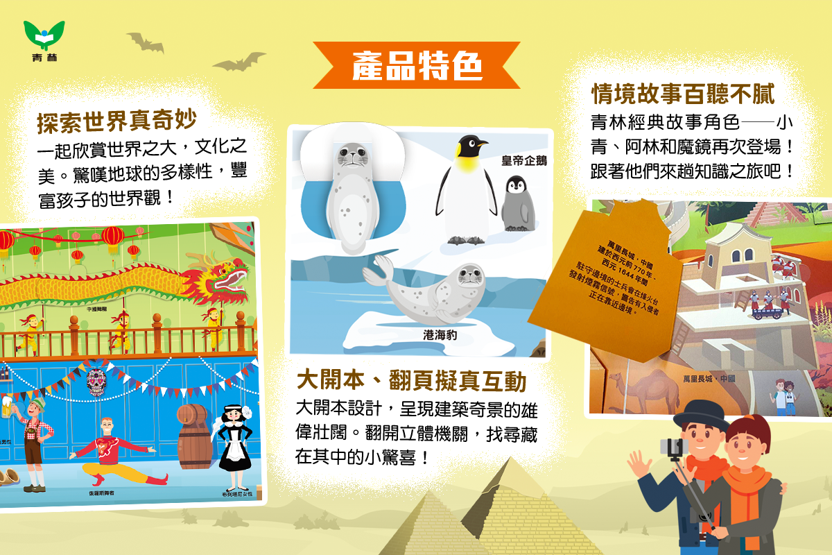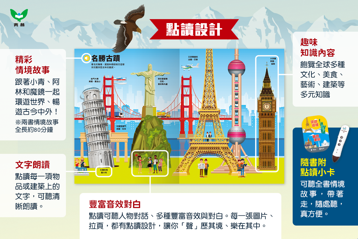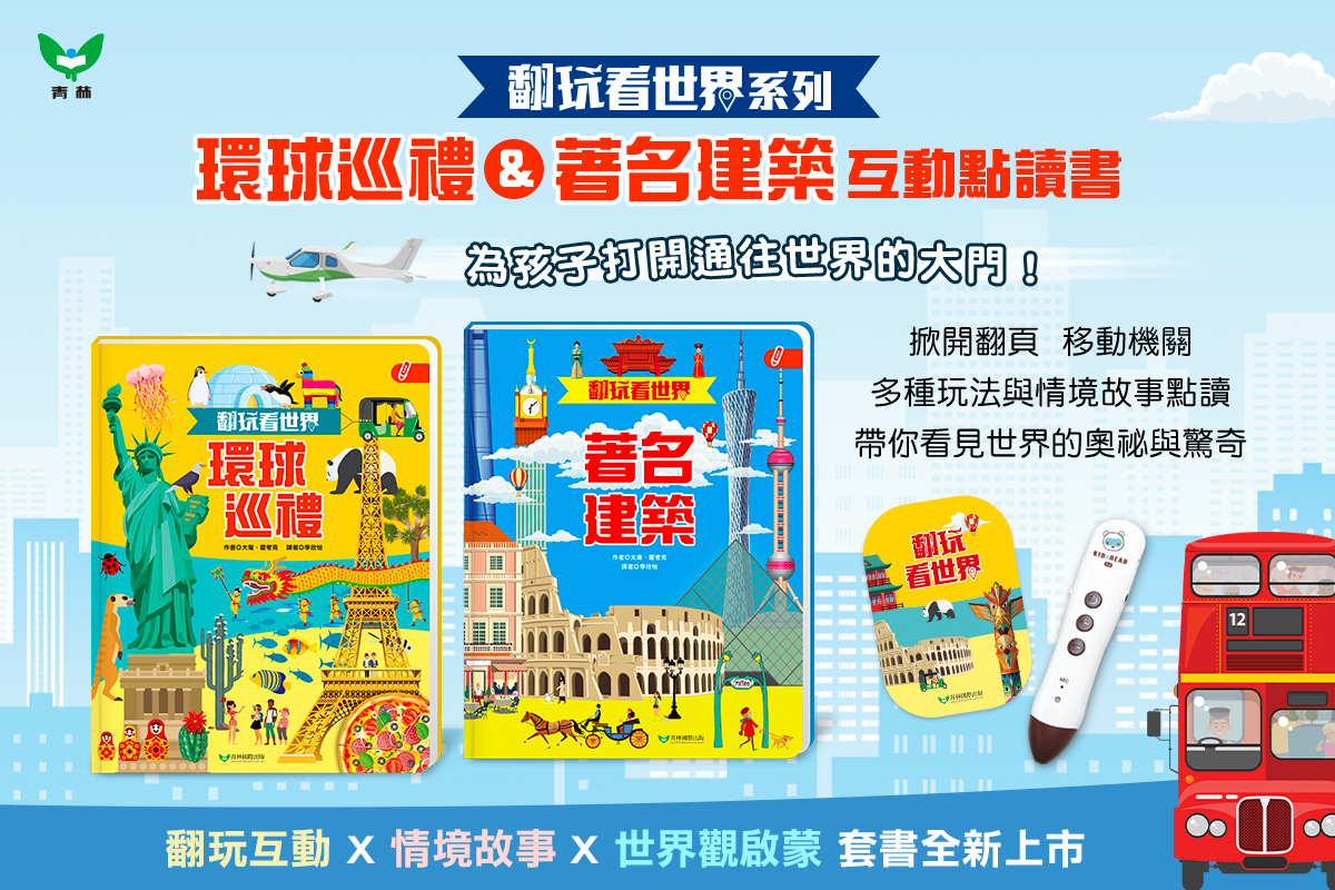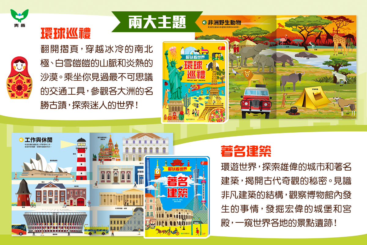 KIDsREAD這套新書不只是『翻』!而是有翻玩互動x情境故事x世界觀啟蒙的功能!由青林經典故事角色:小青、阿林和魔境登場!跟著他們來趟知識之旅;大開本設計、翻頁擬真互動,呈現建築奇景的雄偉壯闊。一起欣賞世界之大、文化之美,豐富孩子的世界觀!