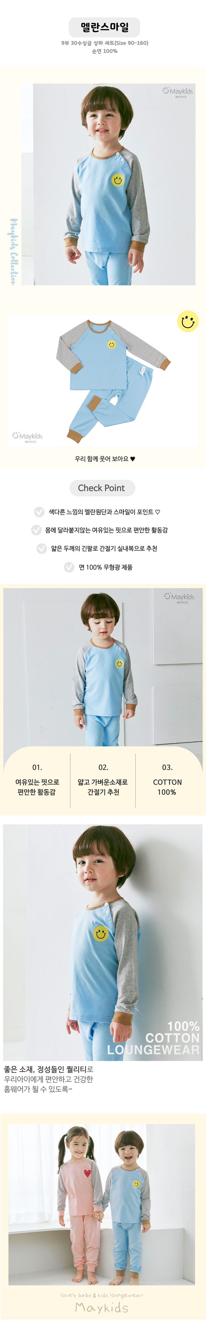 韓國 Maykids - 無螢光30支棉薄長袖家居服-微笑臉-天藍X灰