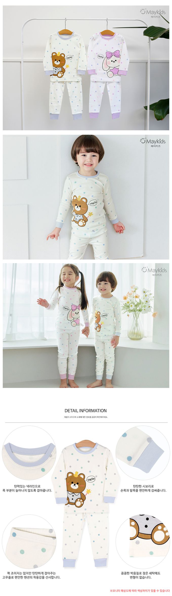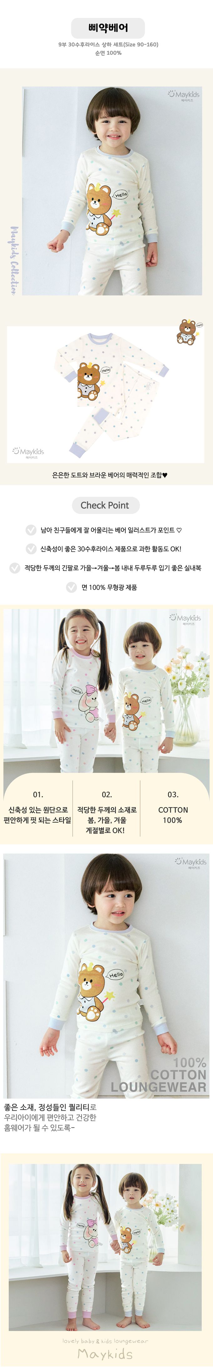 韓國 Maykids - 無螢光30支棉長袖家居服-彩點大熊-米
