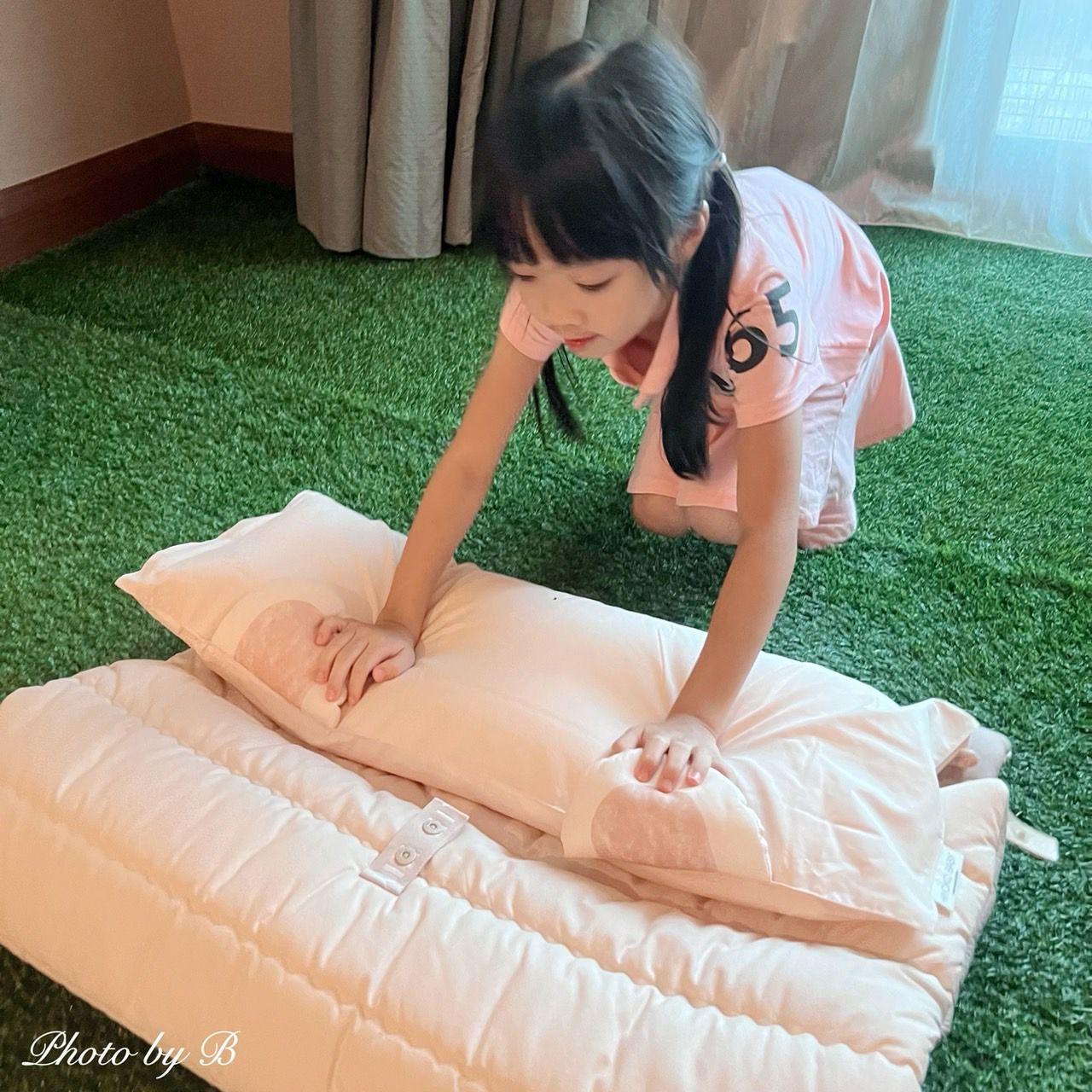 枕頭、睡墊等的側邊有設計有姓名布籤,防止弄丟。
