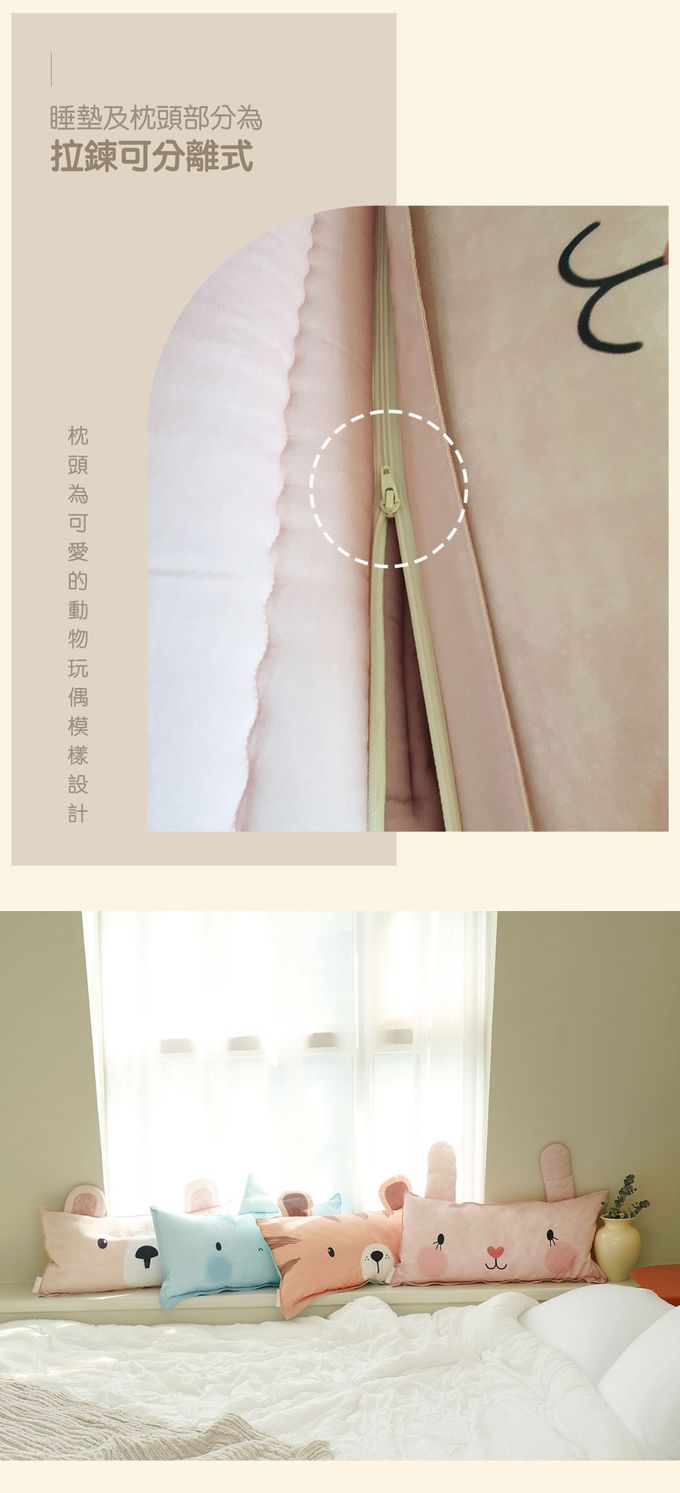 枕頭可以與睡墊分拆使用,大大增加了睡袋的多用途呢!等孩子幼稚園畢業之後,枕頭還可以拆開繼續單獨使用、當抱枕或是睡枕都可以!