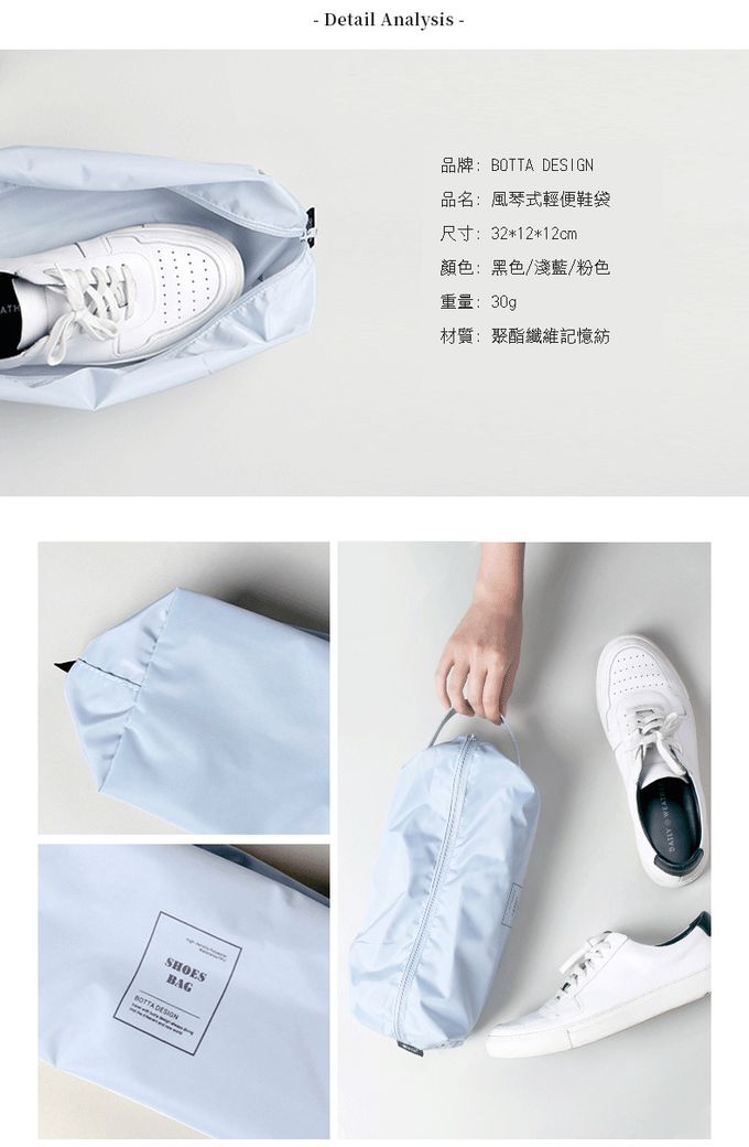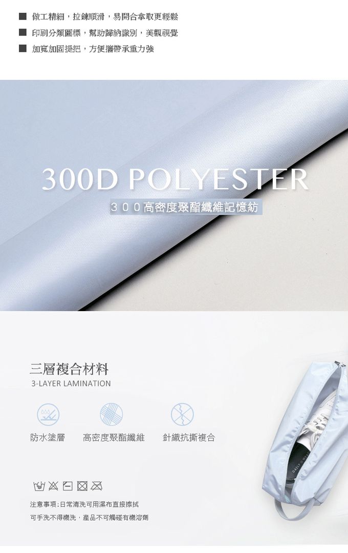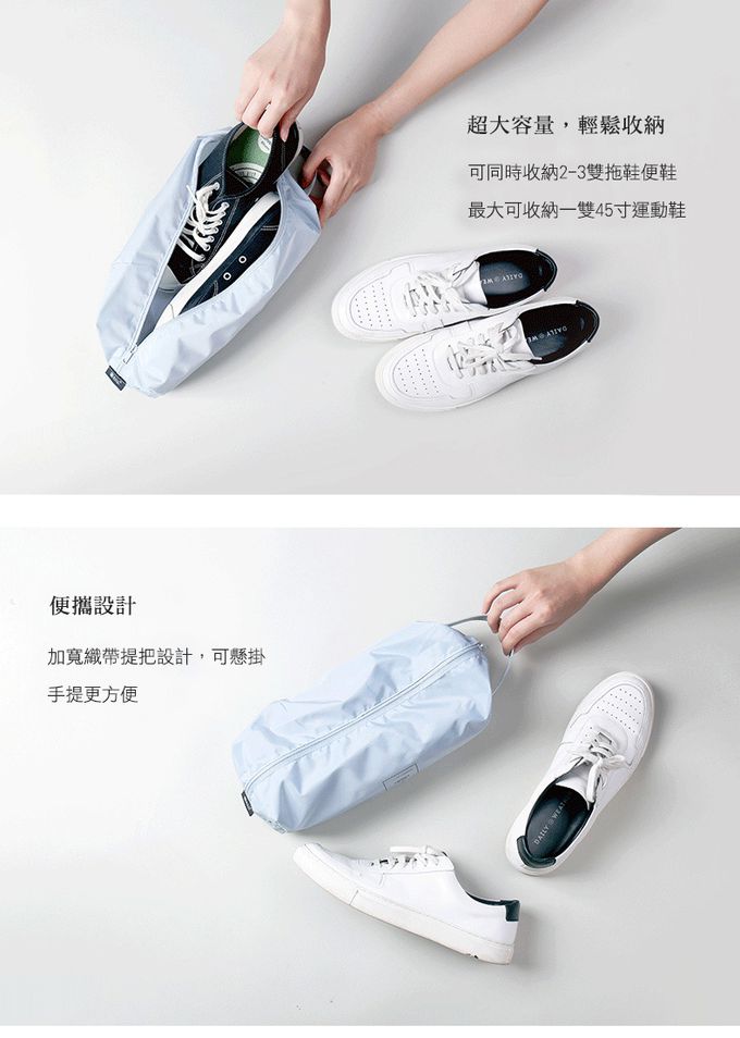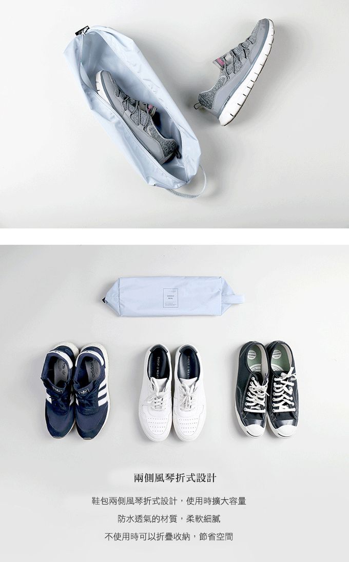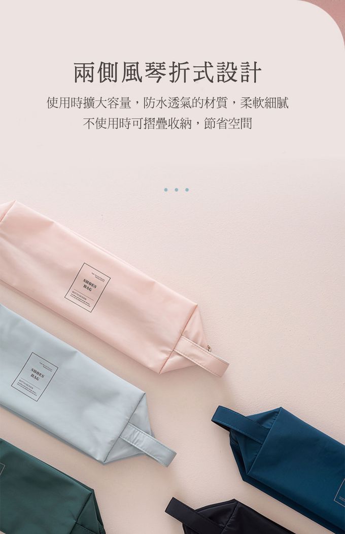 成分:內部空間可輕鬆放下拖鞋、運動鞋或皮鞋等, 無論是商務出差、旅行出遊或居家收納,一包搞定! 鞋包兩側風琴折式設計,使用時擴大容量 防潑水透氣的材質,柔軟細膩 不使用時可以折疊收納,節省空間