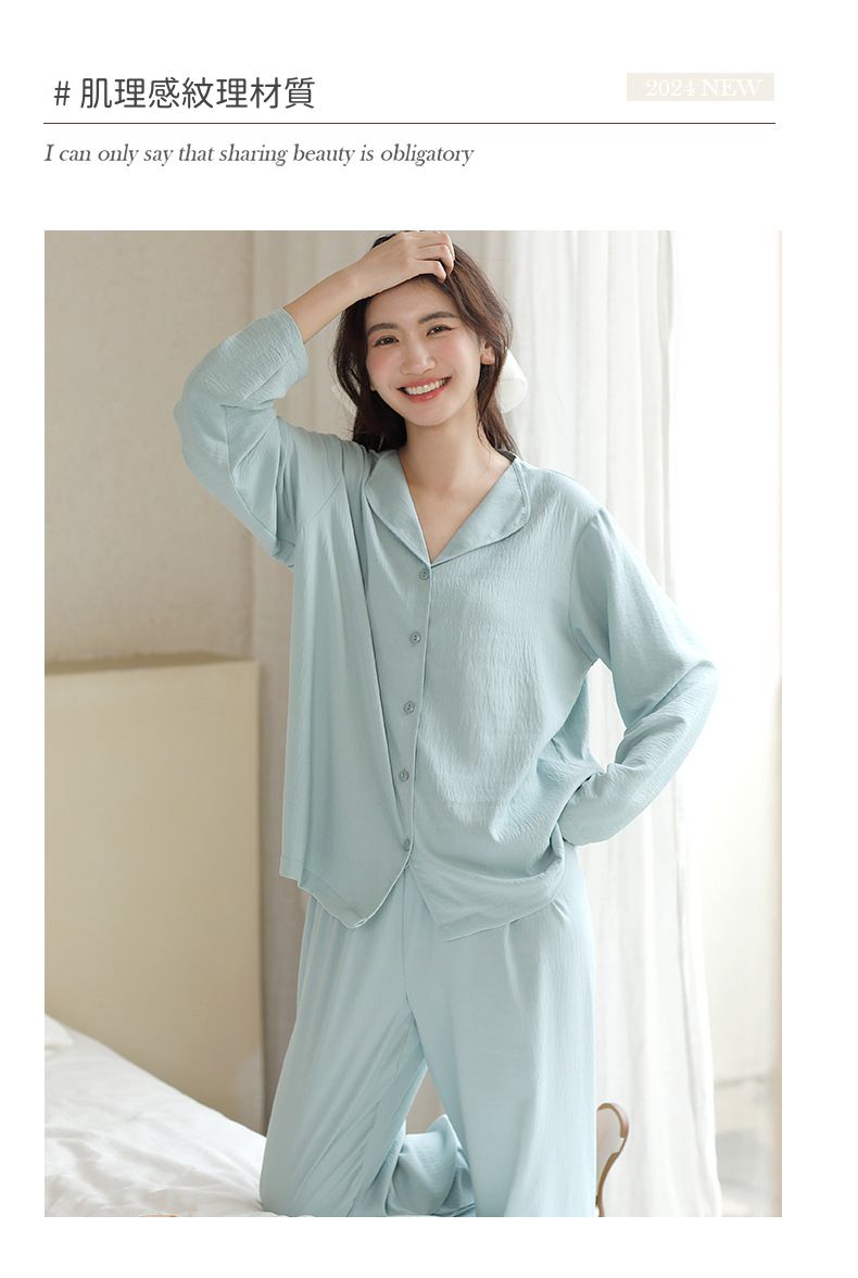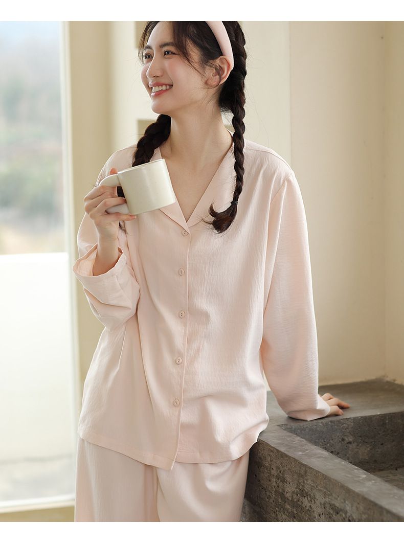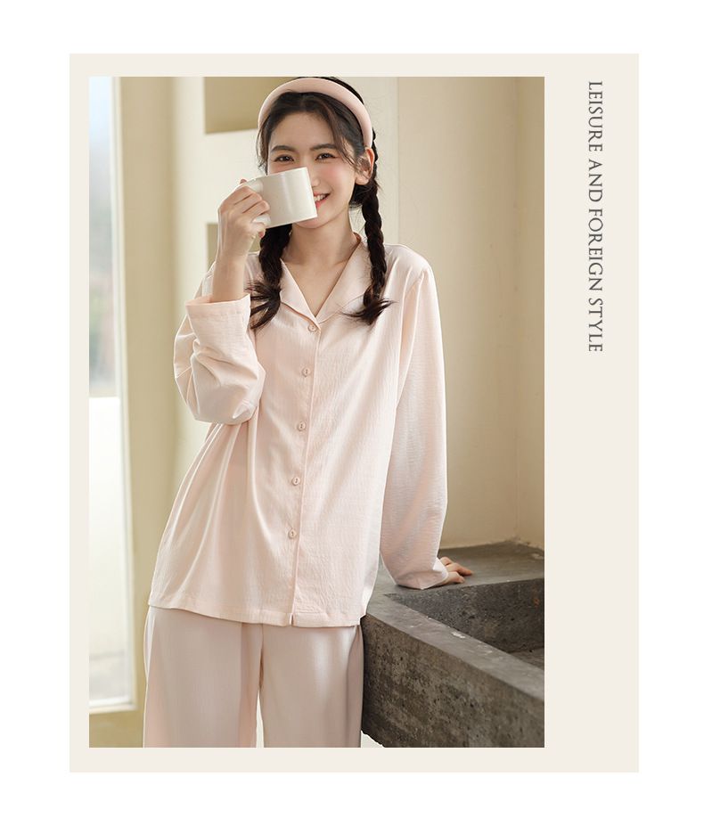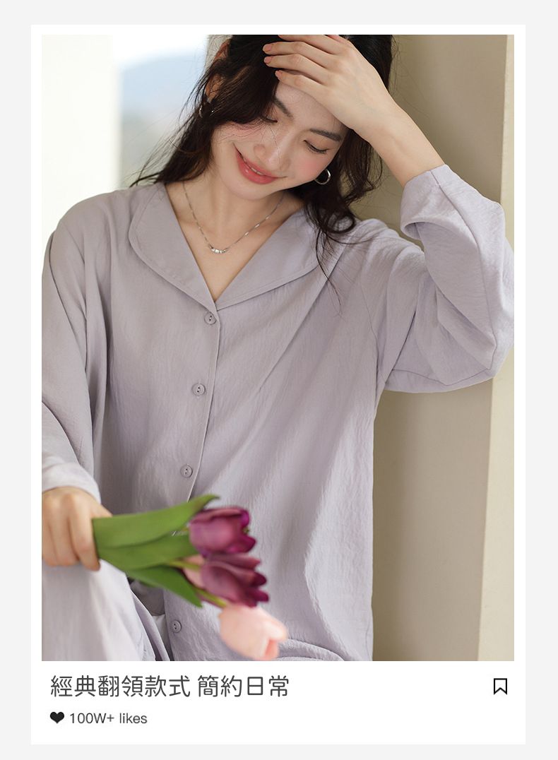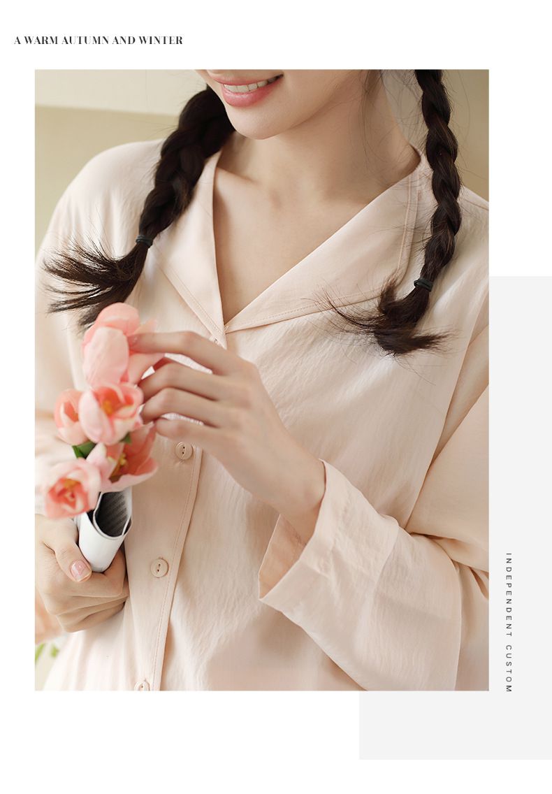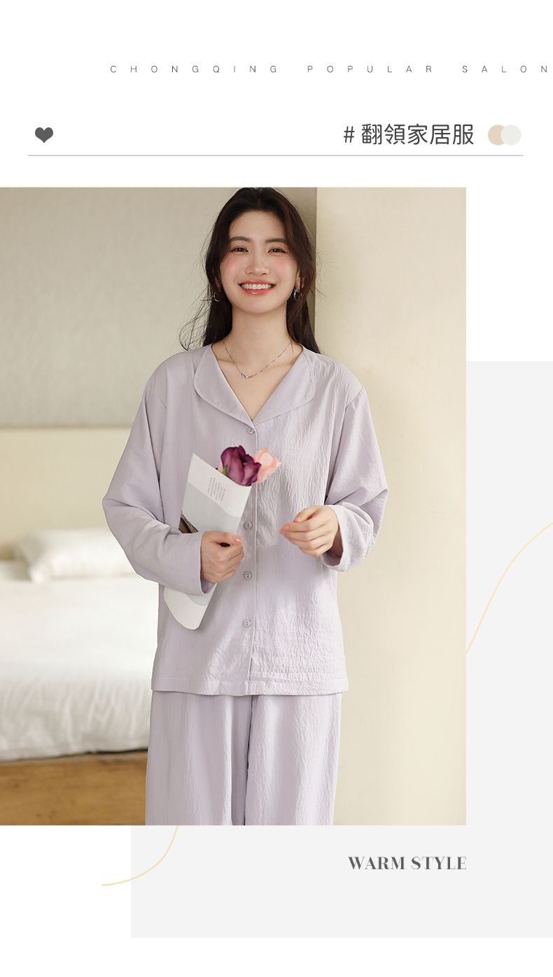 雲柔感質感翻領長袖+長褲套裝-仙粿粉 (F)