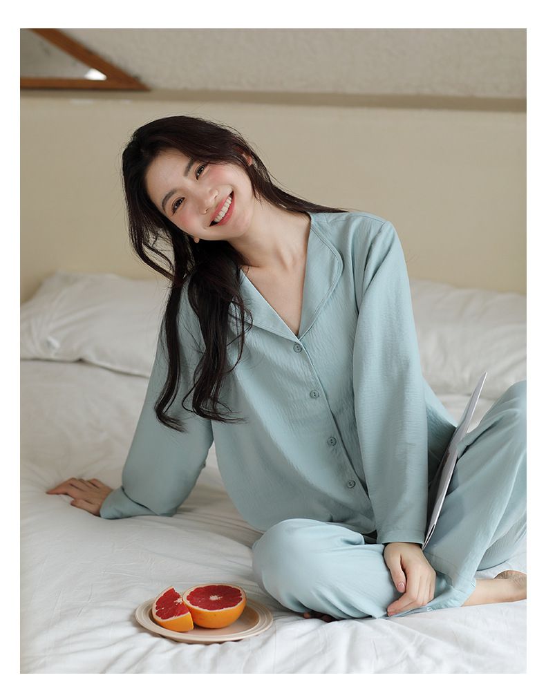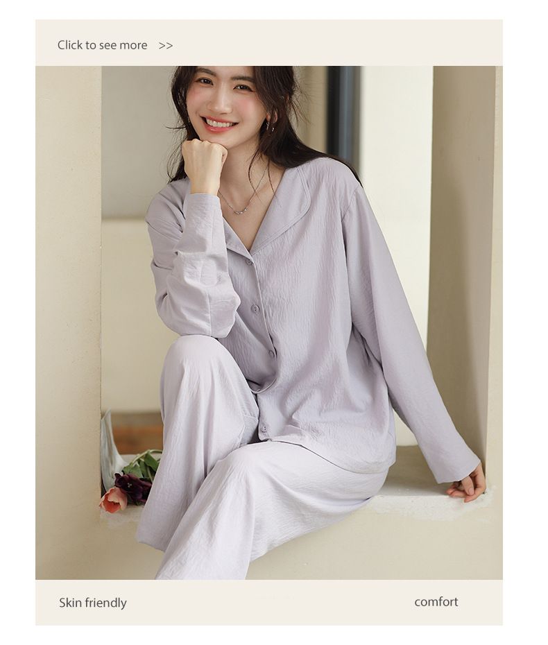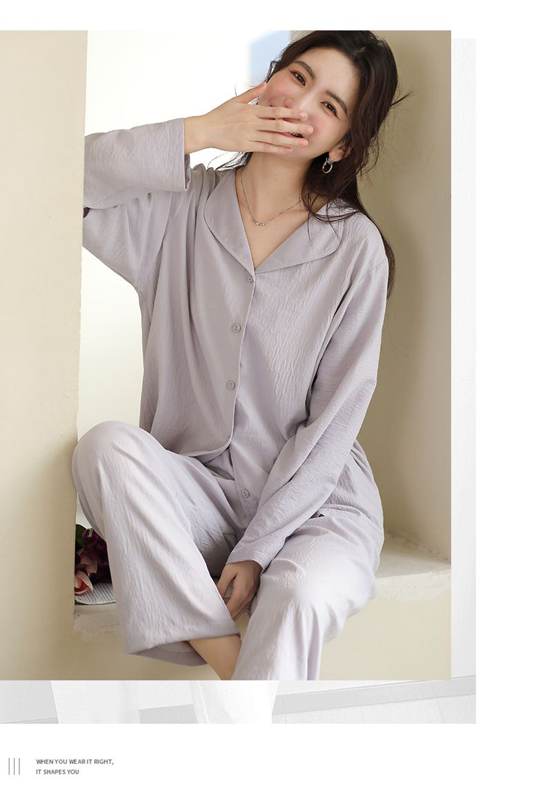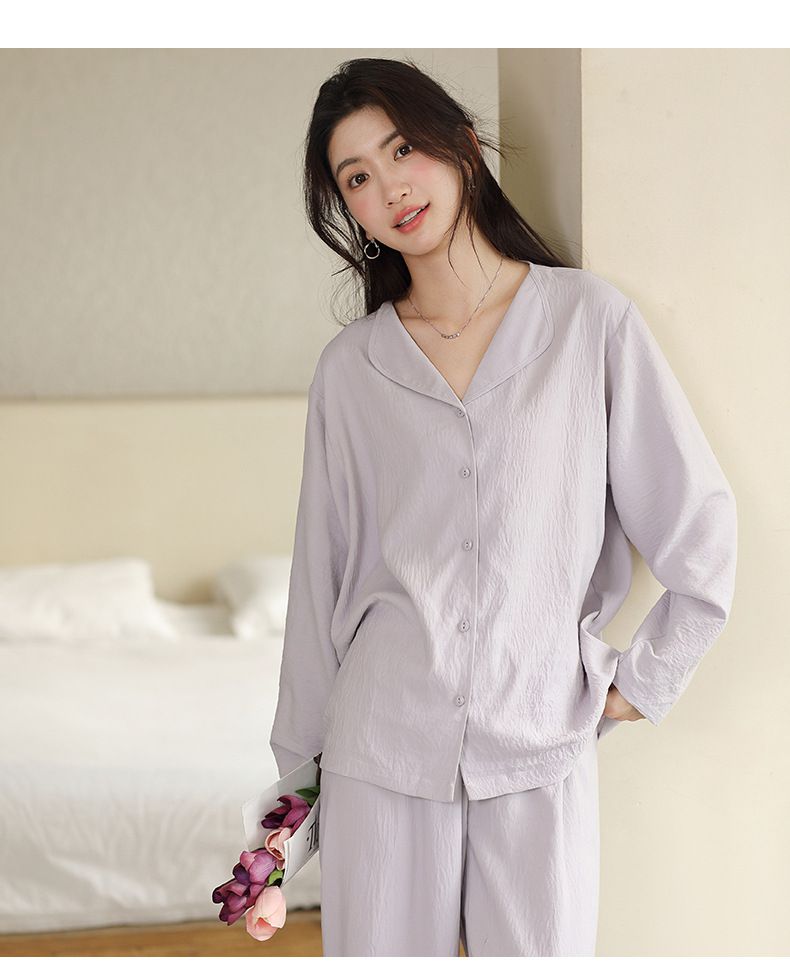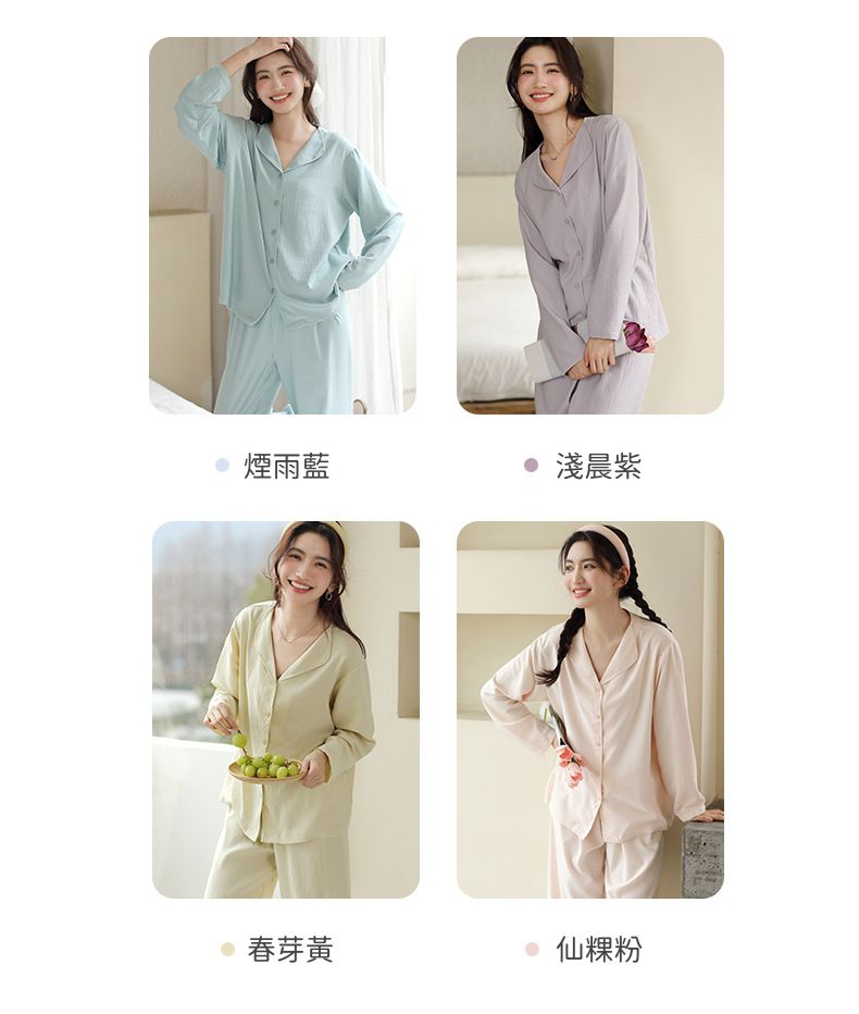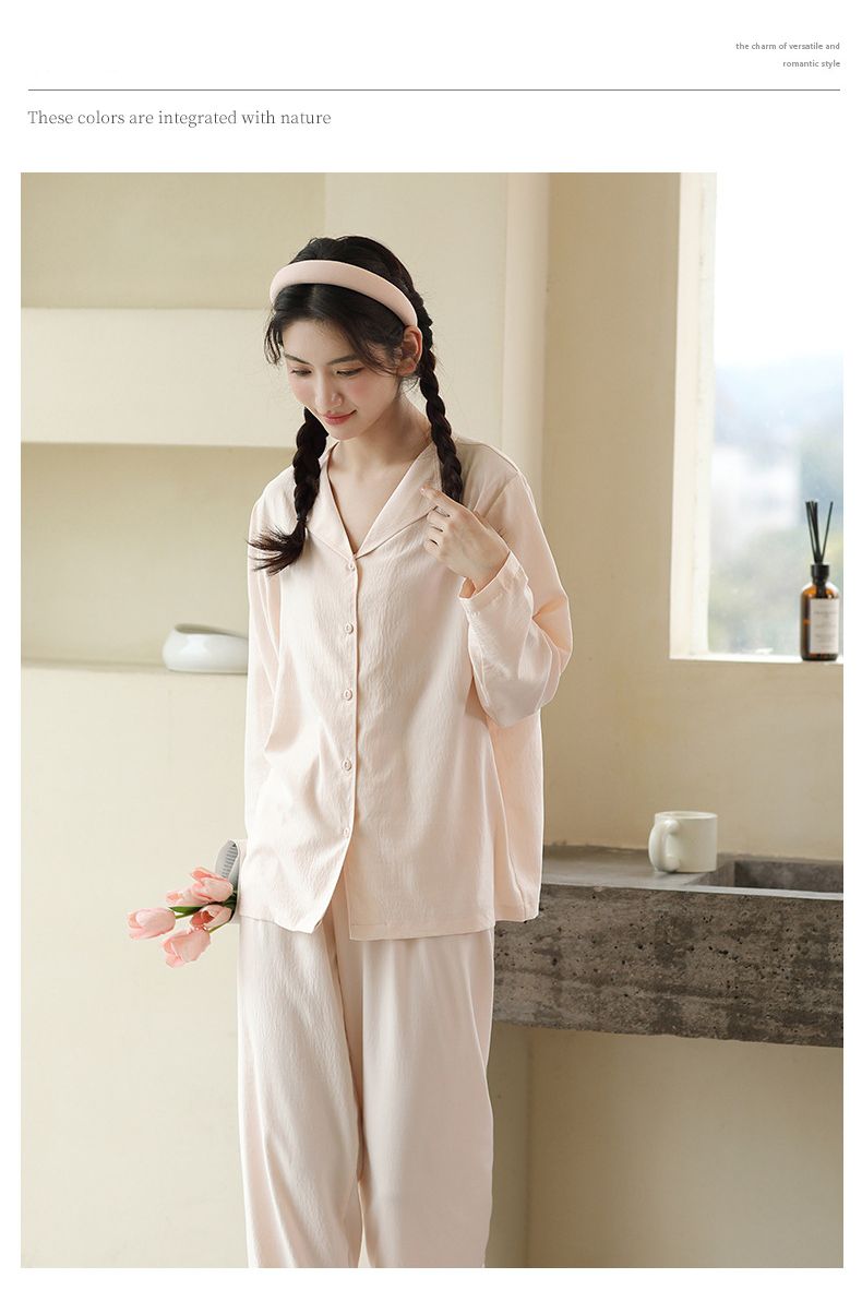 雲柔感質感翻領長袖+長褲套裝-仙粿粉 (F)