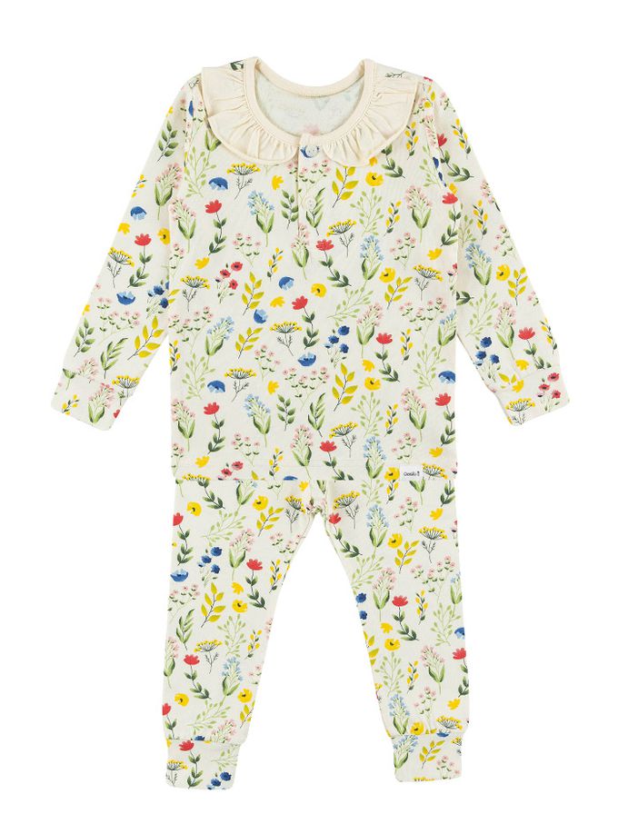 韓國 Cordi-i - 無螢光棉薄款彈性長袖家居服-彩色花圃-米黃