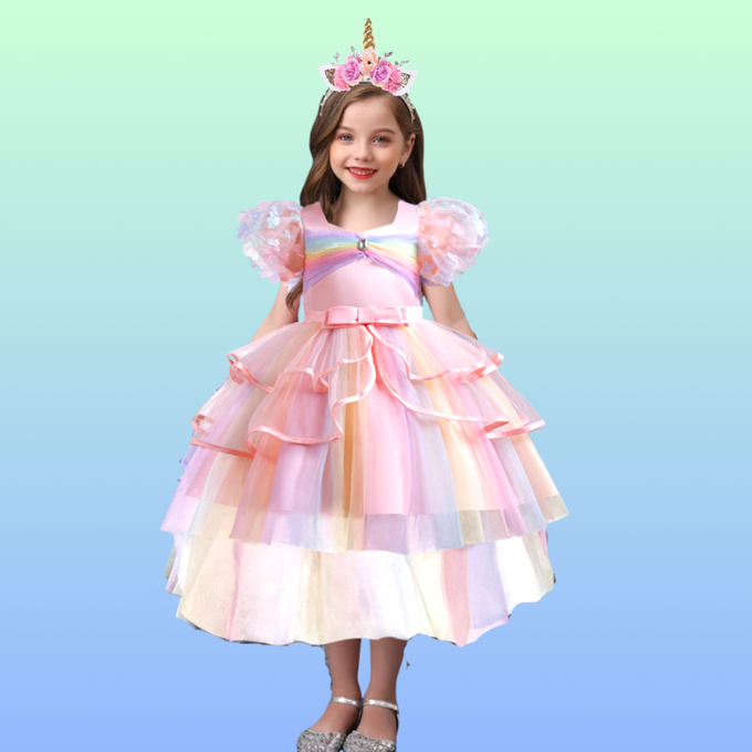 品名:繽紛彩虹花瓣網紗澎裙2WAY穿搭長禮服-獨家贈獨角獸髮箍