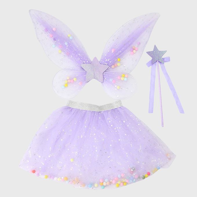 網紗毛毛球蝴蝶翅膀澎澎裙仙女棒三件套組-淺紫色 (105~125 cm)