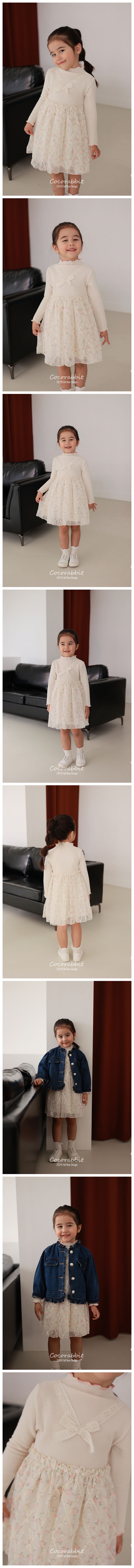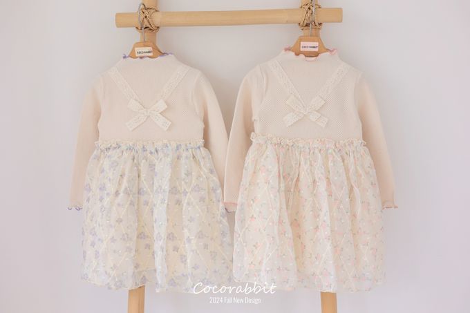 韓國 Coco Rabbit - 花印網紗裝飾長袖洋裝-粉花