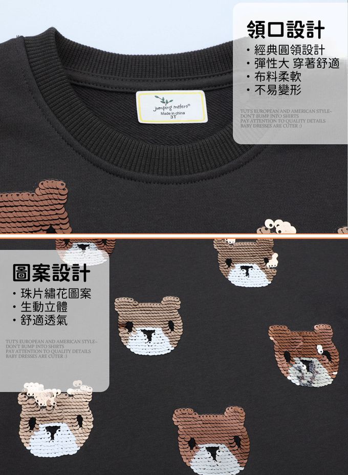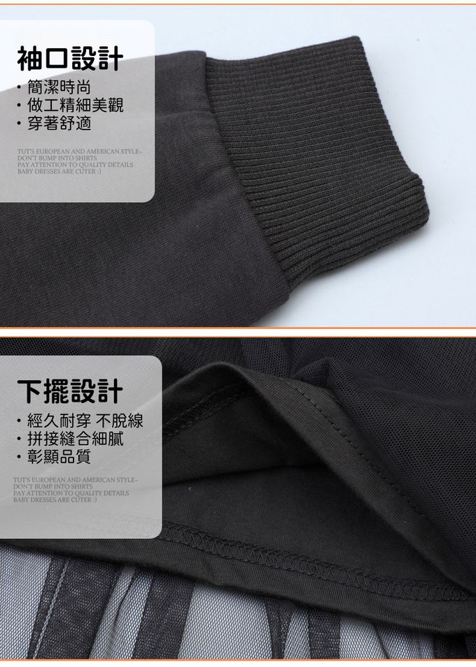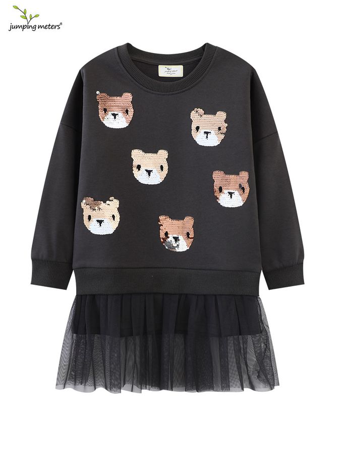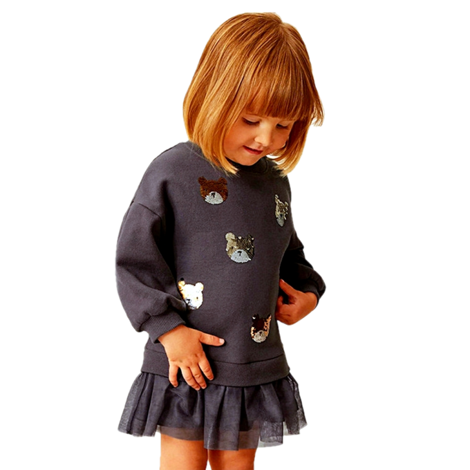 棉質圓領長袖連身網紗洋裝-亮片熊熊-深灰