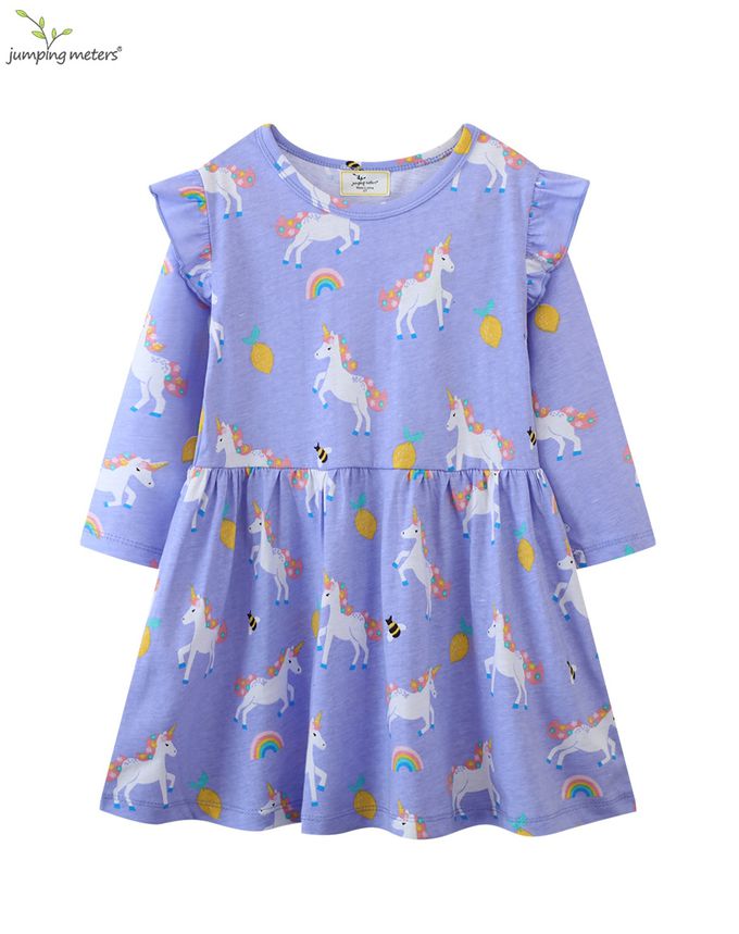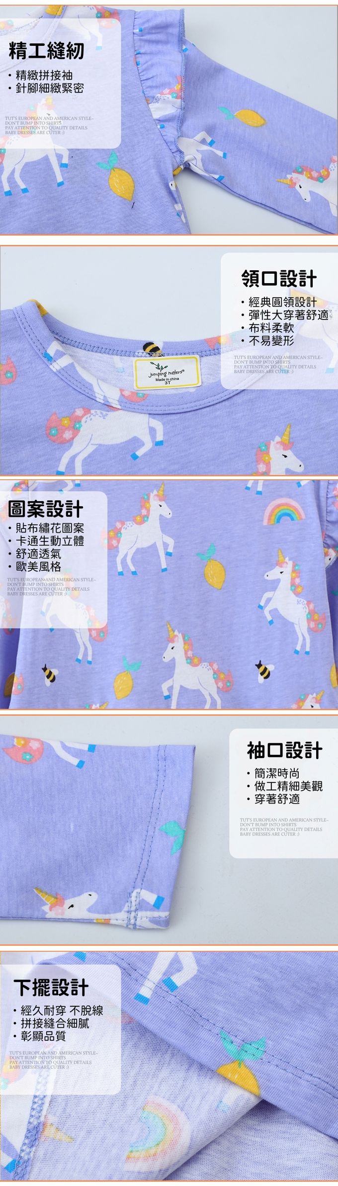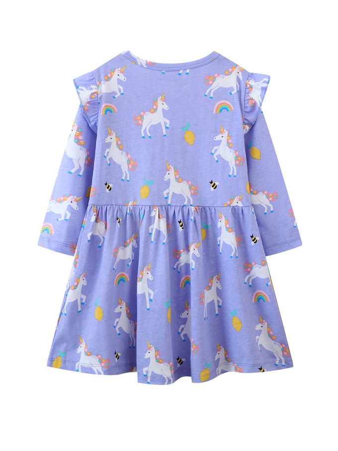 棉質圓領荷葉邊長袖連身洋裝-滿滿獨角獸-紫色