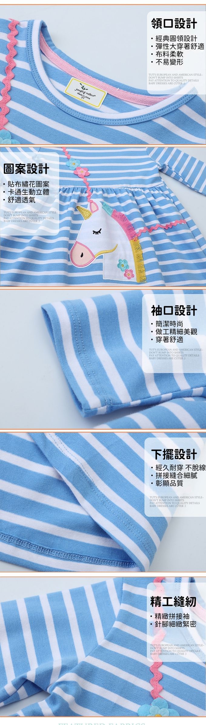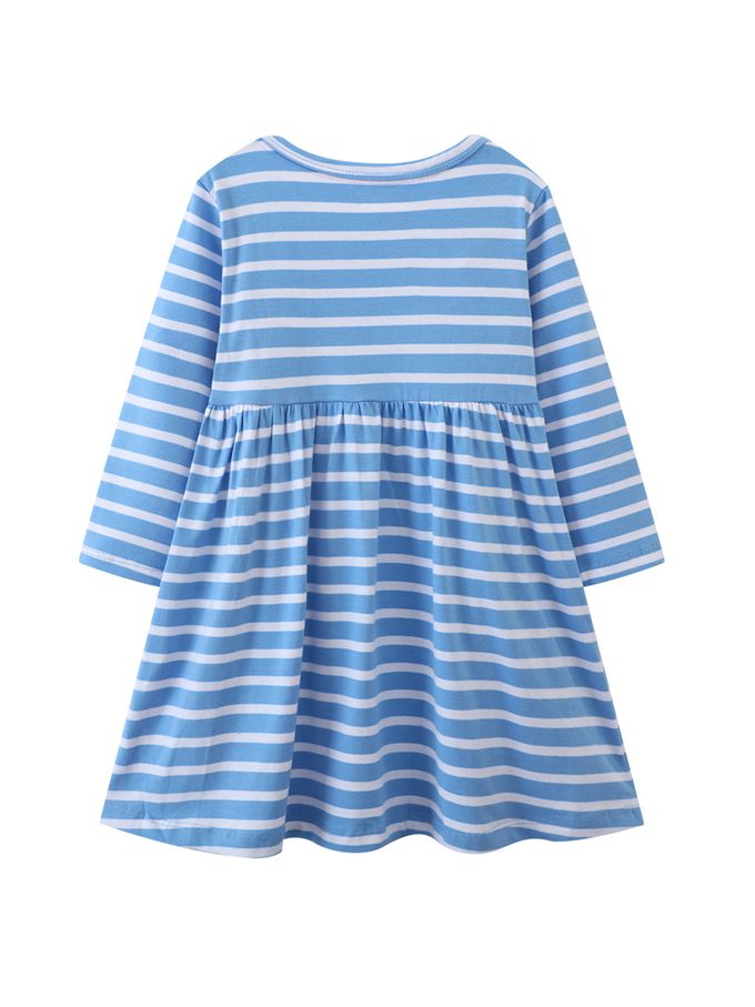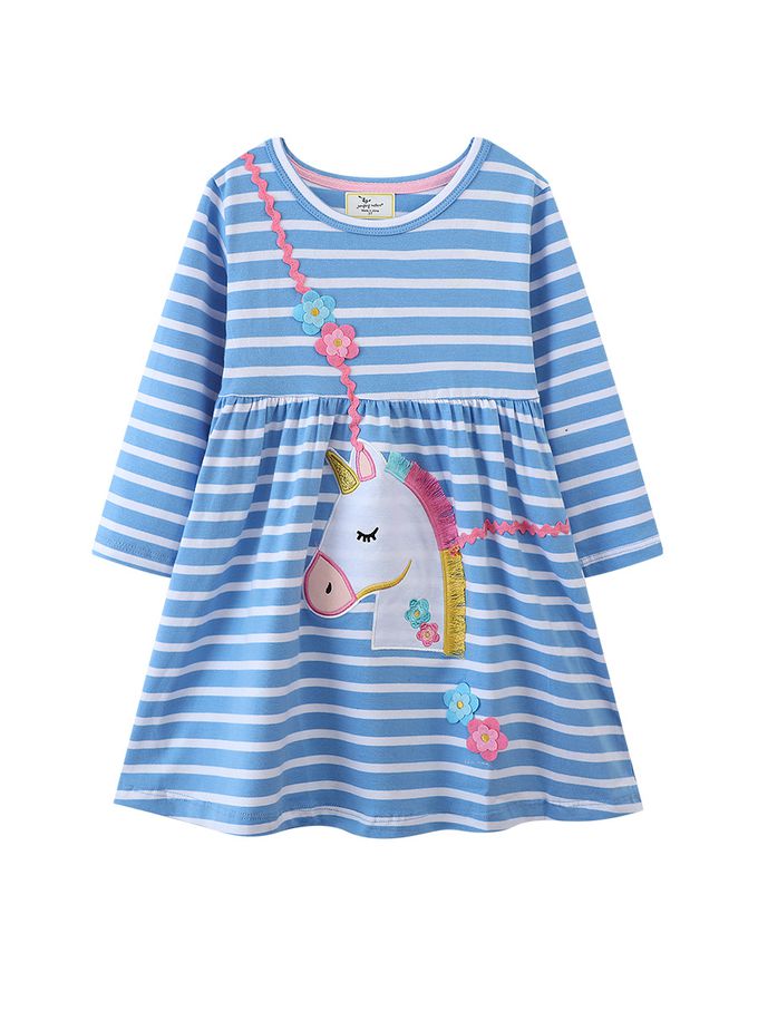 棉質圓領長袖連身洋裝-獨角獸花朵背帶-藍色條紋