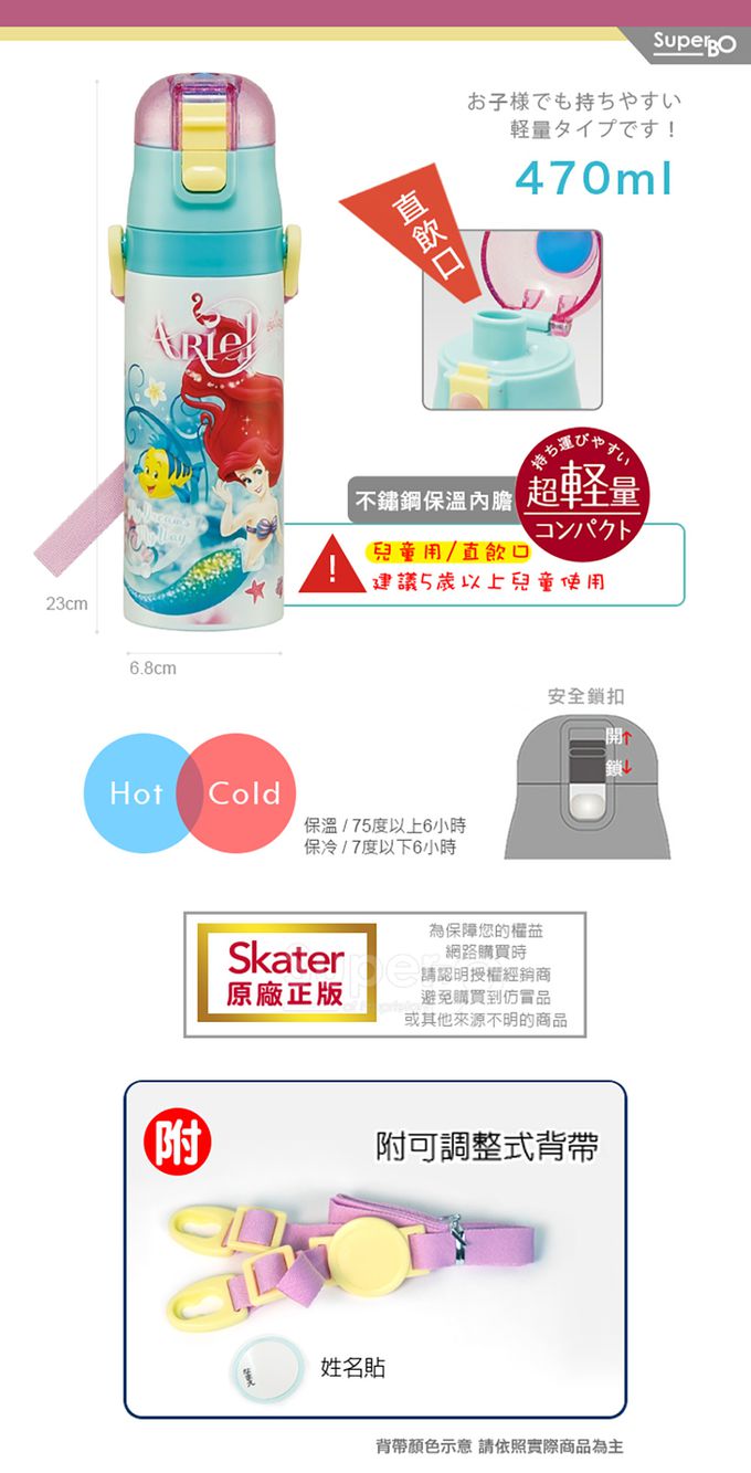 (兒童)不鏽鋼直飲保溫水壺-小美人魚Ariel-470ml
