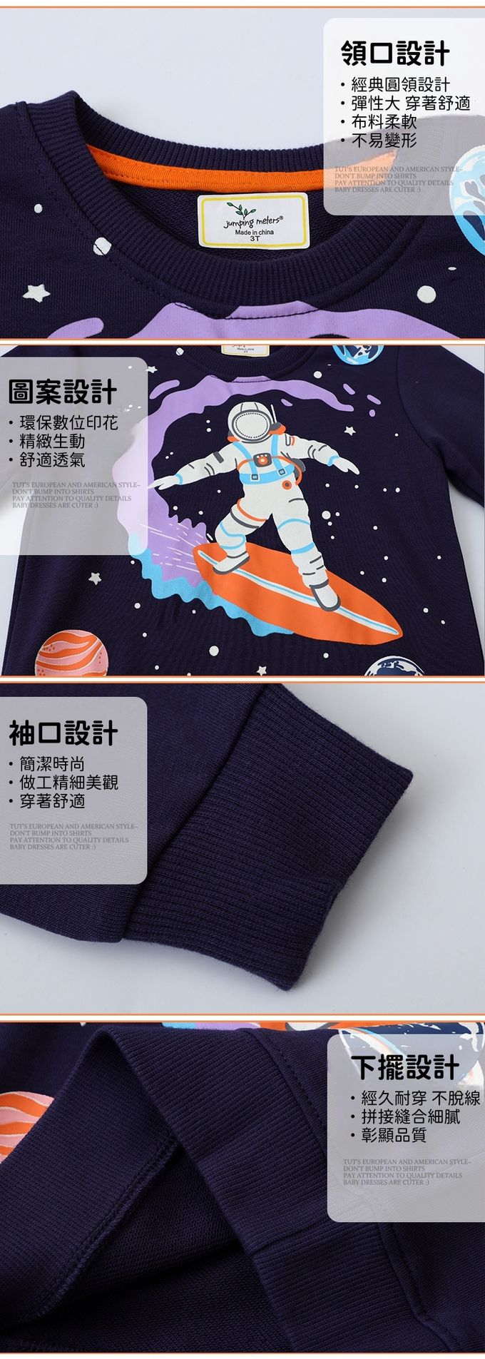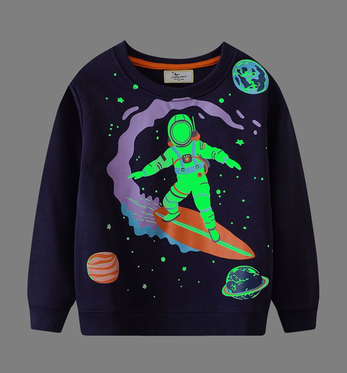 夜光圓領棉質長袖上衣/大學T-太空人探險-藏青