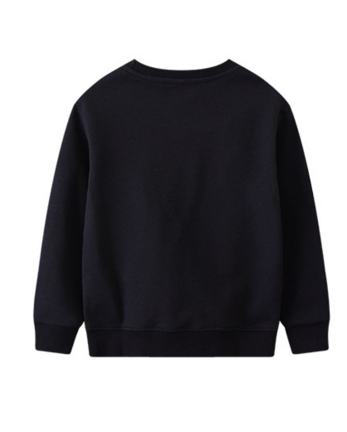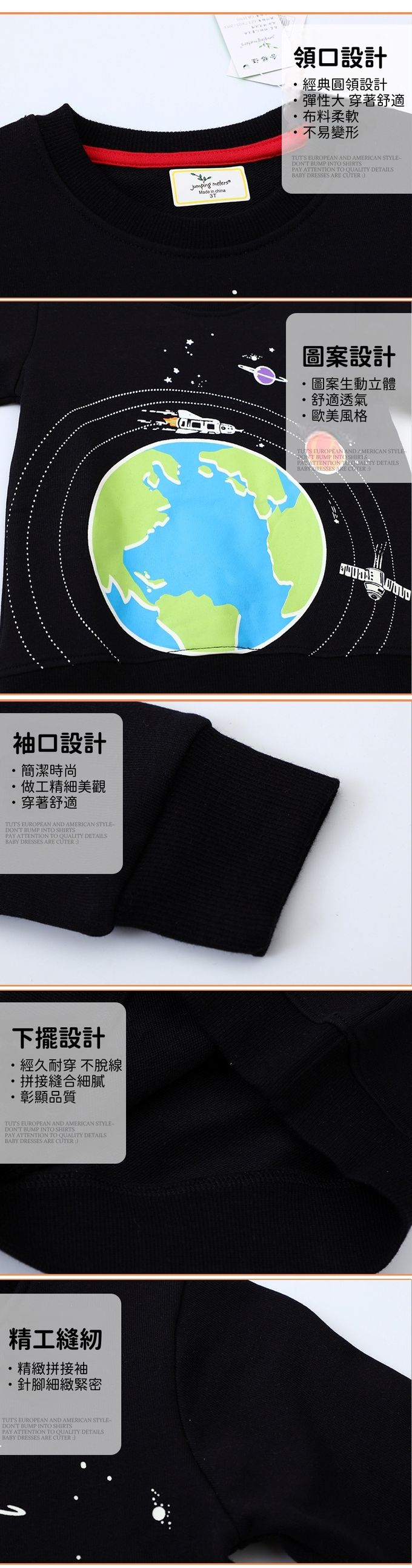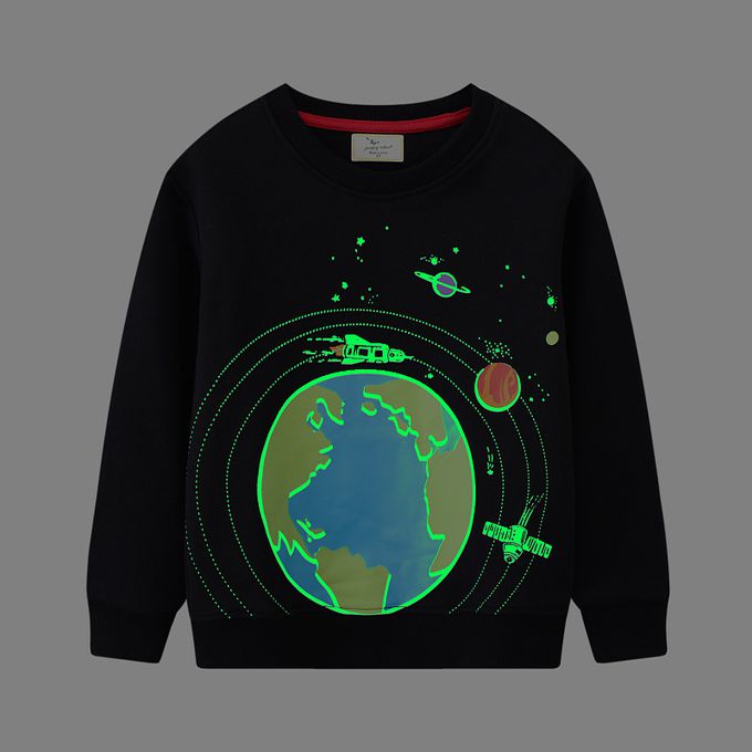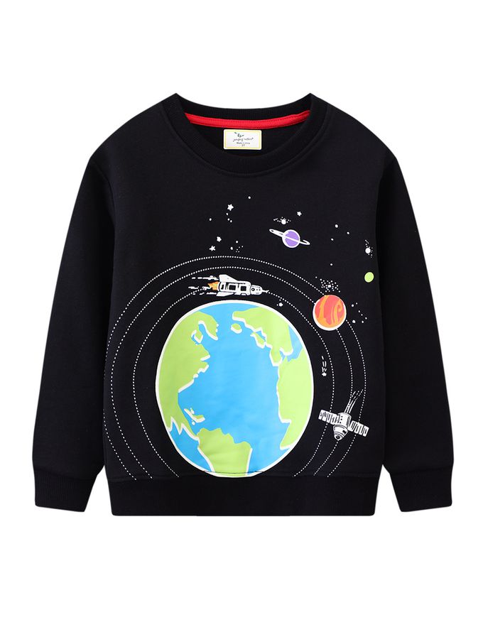 夜光圓領棉質長袖上衣/大學T-行星地球-黑色