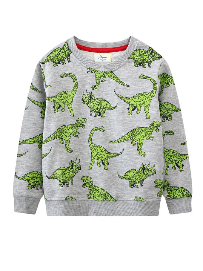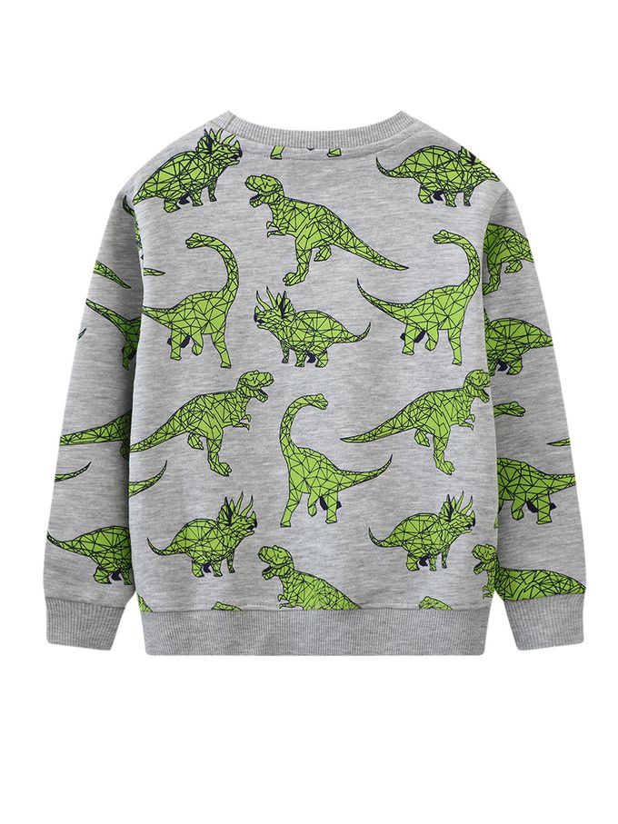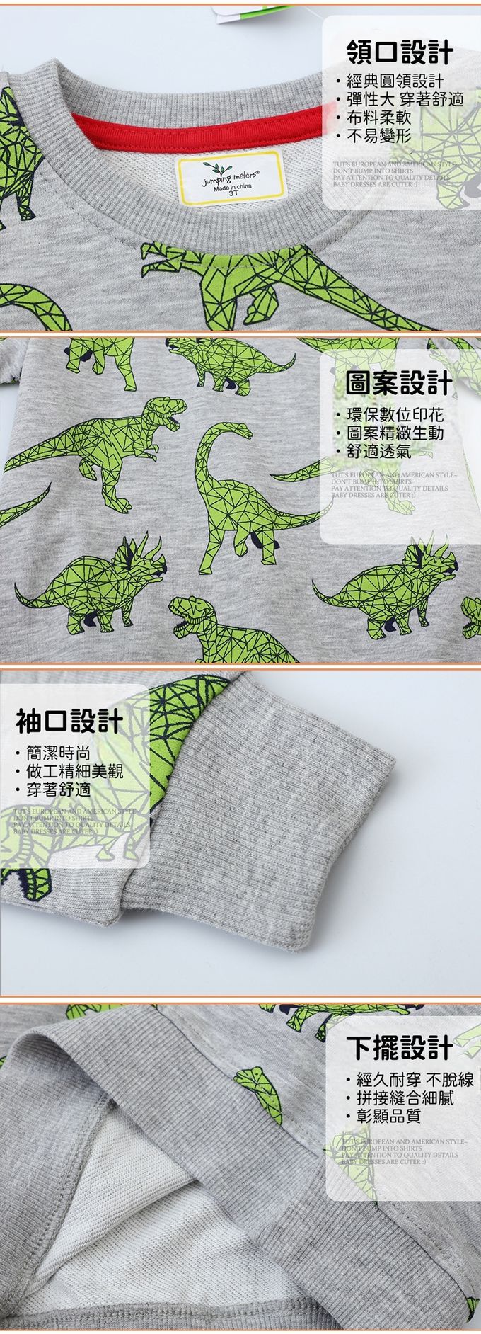 Jumping meters - 圓領棉質長袖上衣/大學T-螢光綠恐龍-灰色