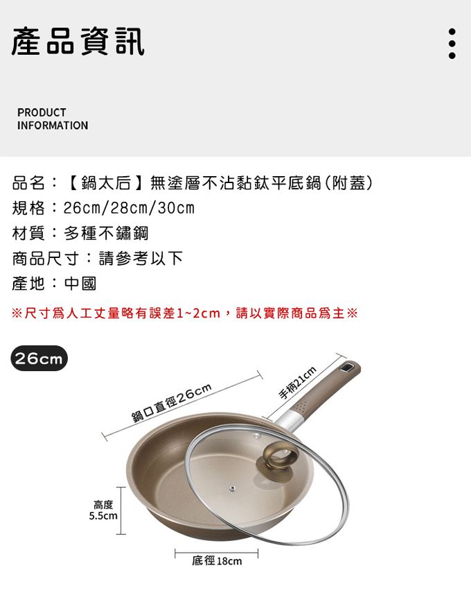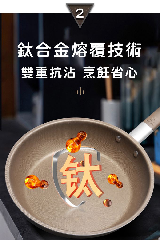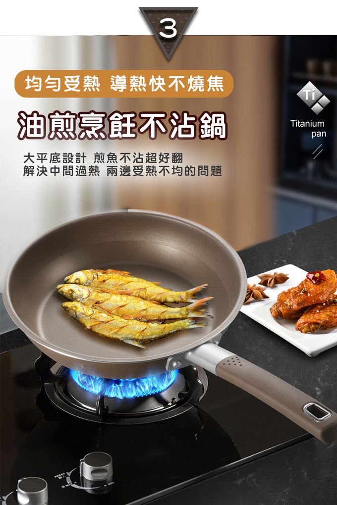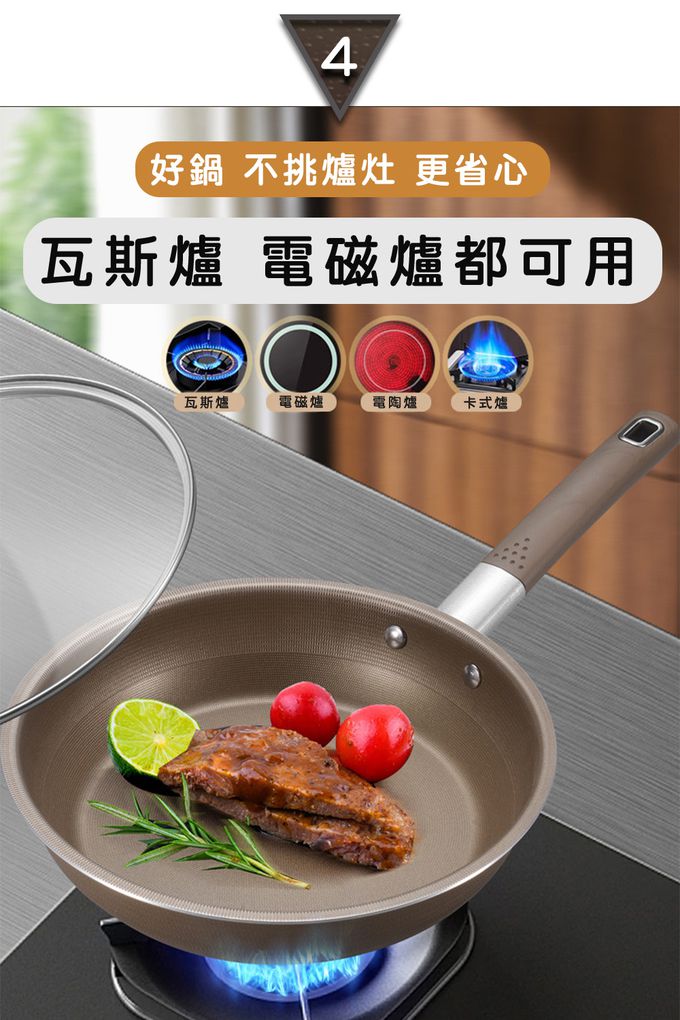 品名:無塗層不沾黏鈦鍋/鈦合金平底鍋/單柄帶蓋平底鍋-28cm