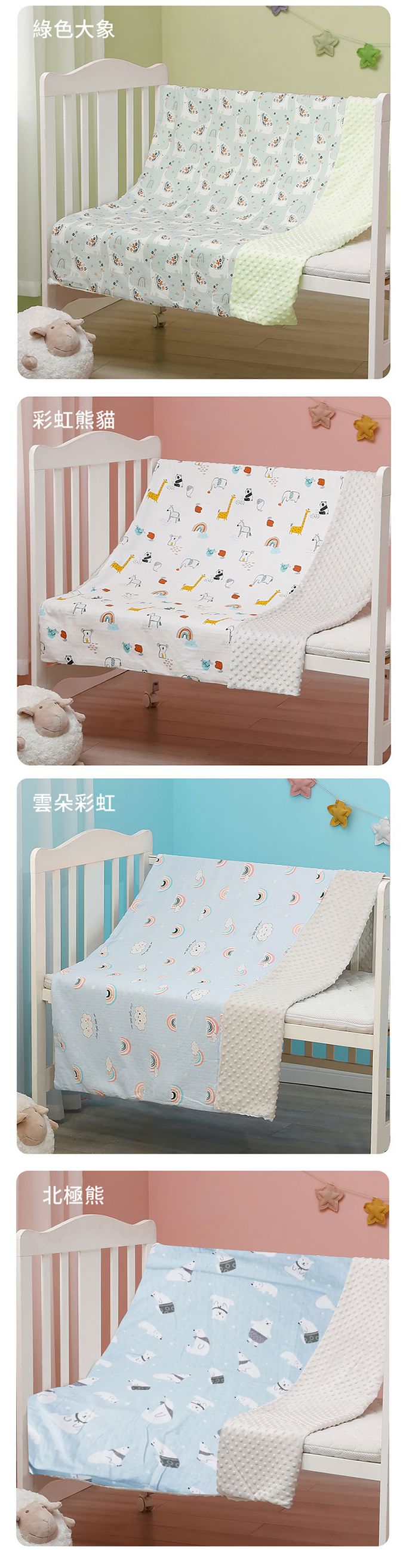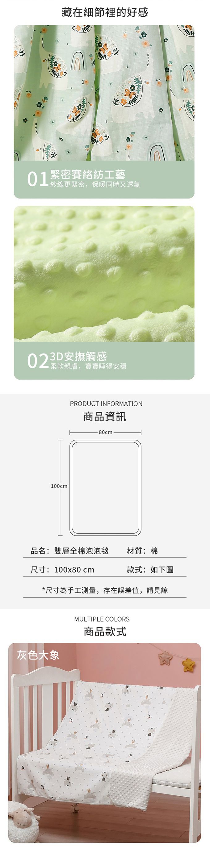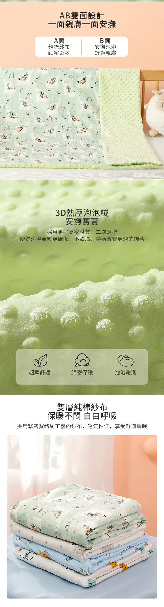 2.AB雙面設計,A面精梳紗布,B面安撫泡泡舒適觸感