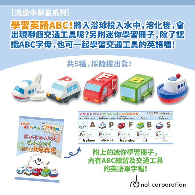 學習英語ABC!將入浴球投入水中,溶化後,會出現哪個交通工具呢? 另附迷你學習冊子,除了認識ABC字母,也可一起學習交通工具的英語喔!