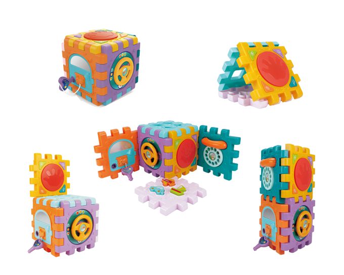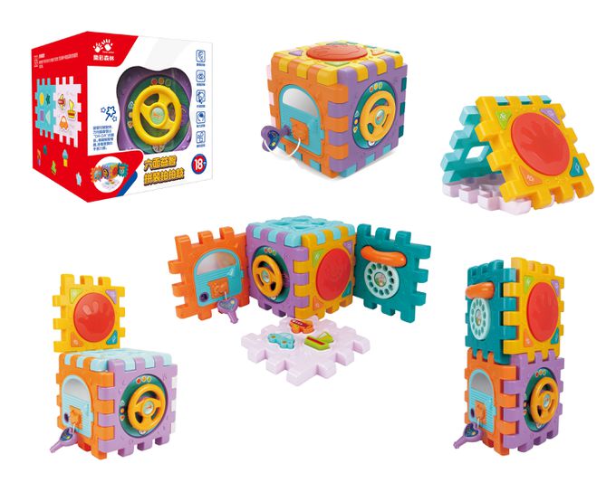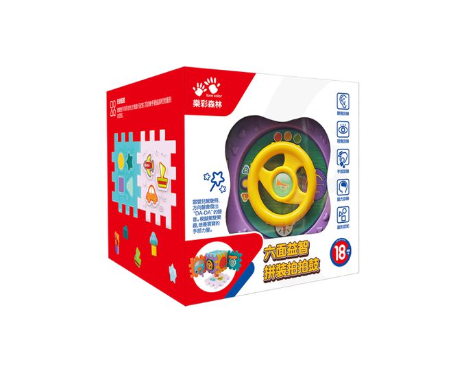 2.採用6面積木拼裝的形式,可拆解後重新DIY組裝,自由發揮想象力,多功能六合一設計,每一面都是不同的遊戲哦,有交通工具配對、幾何圖形配對、模擬方向盤、模擬電話機、帶有聲音燈光的拍拍鼓、收納寶箱,樂趣加倍。