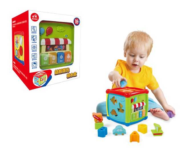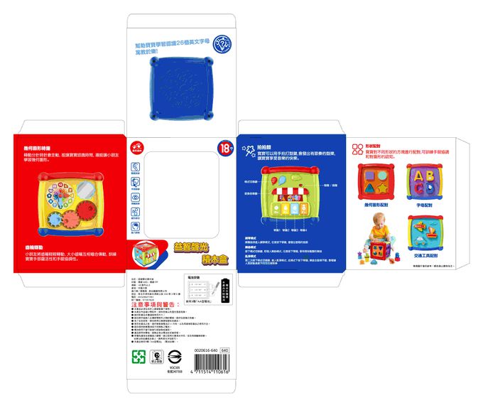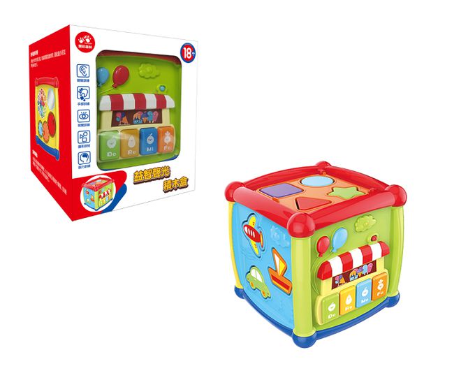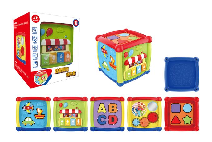 2.趣味智立方,六面可玩,每一個面都是不同的遊戲哦,有交通工具配對、幾何圖形配對、字母配對、幾何圖形時鐘+齒輪轉動、帶有聲音燈光的鋼琴面板、26個英文字母記憶樹,也可做收納藏寶盒,樂趣加倍。