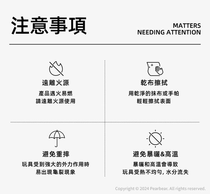 注意事項:本產品必須在成人陪同下使用,並遠離火源, 不適合6歲以下兒童且應避免吞食造成窒息。