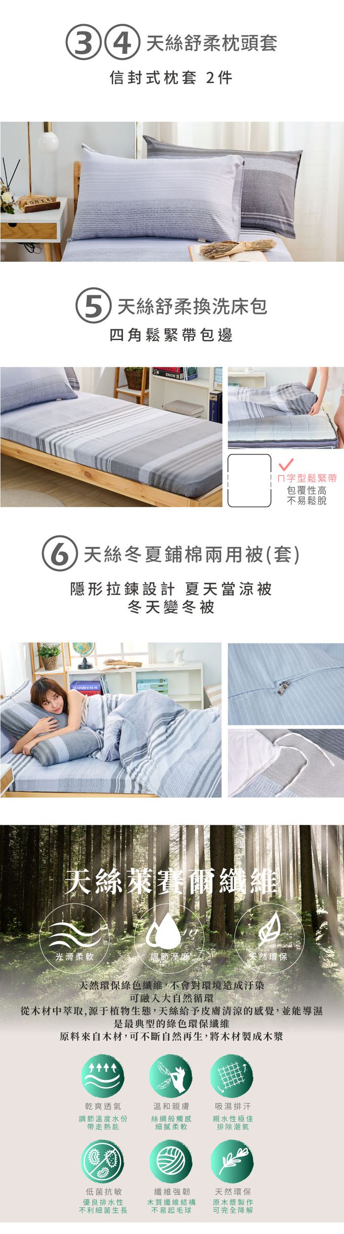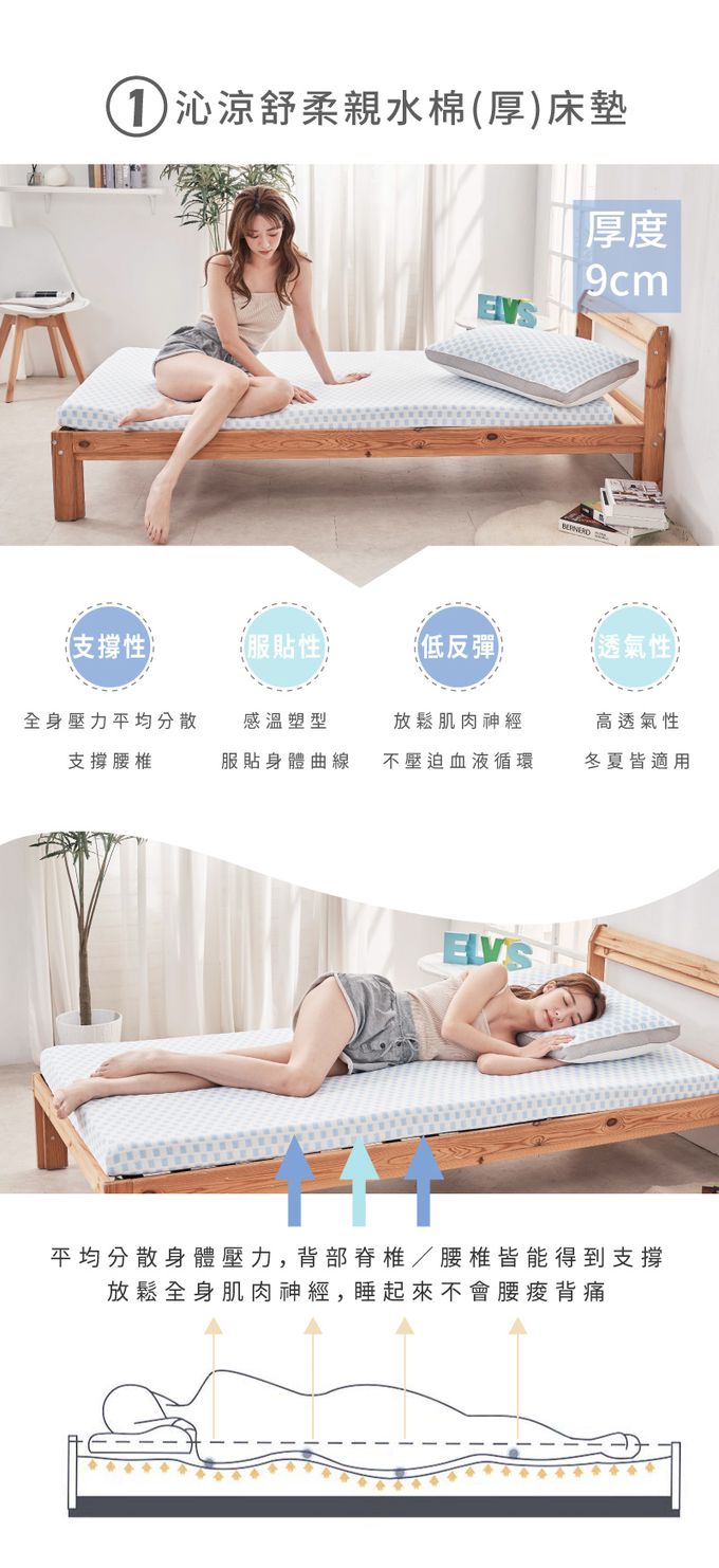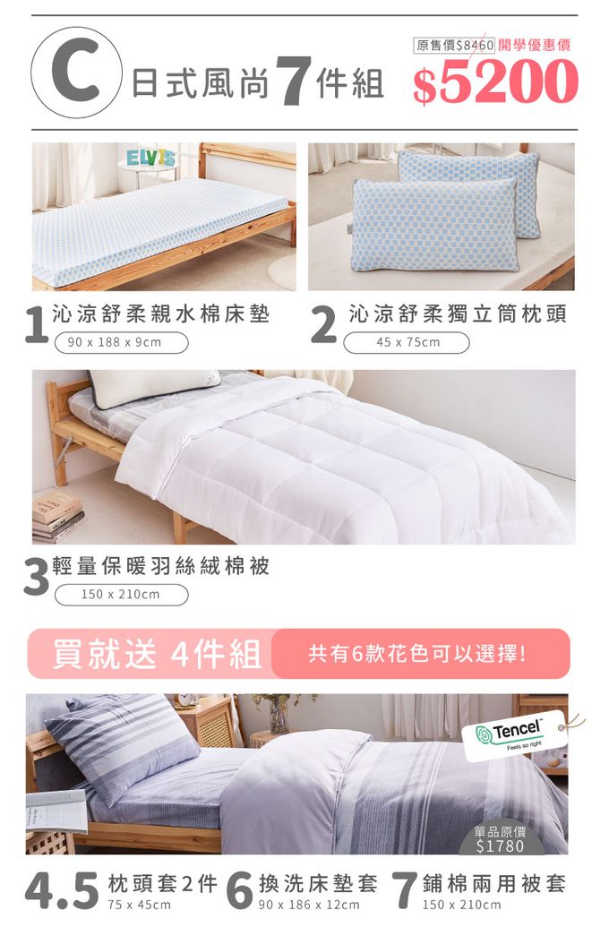 • 成分:沁涼舒柔親水棉床墊 90/105 x188x9cm 沁涼舒柔獨立筒枕頭 75x45cm 天絲枕頭套2件 45x75cm 天絲換洗床包 符合床墊 天絲鋪棉兩用被套 150x210cm 輕量保暖水洗棉被 150x210cm