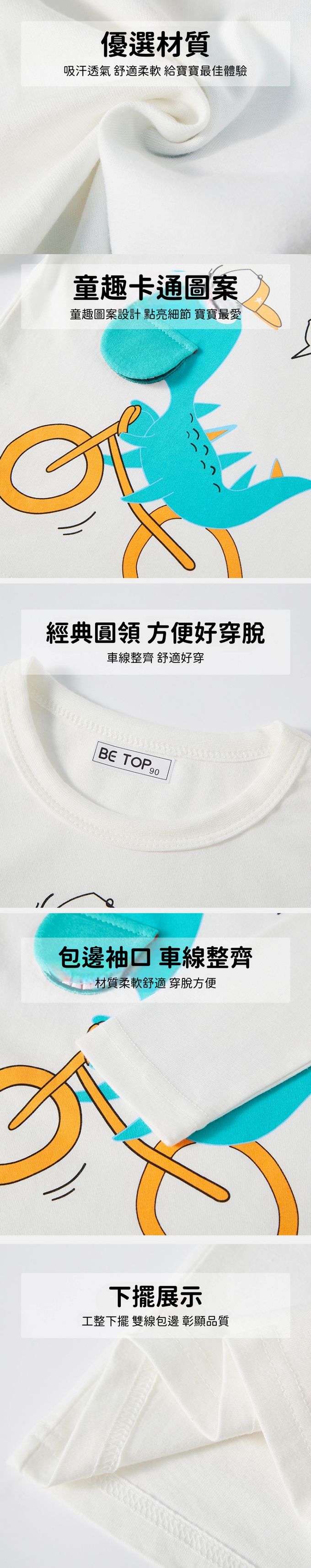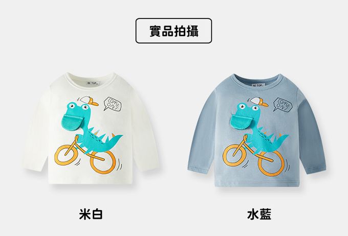 純棉圓領立體薄長袖上衣-恐龍學騎車-米白