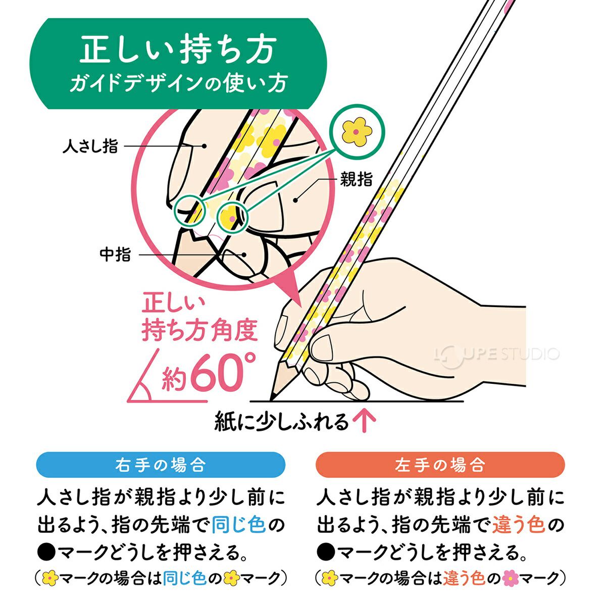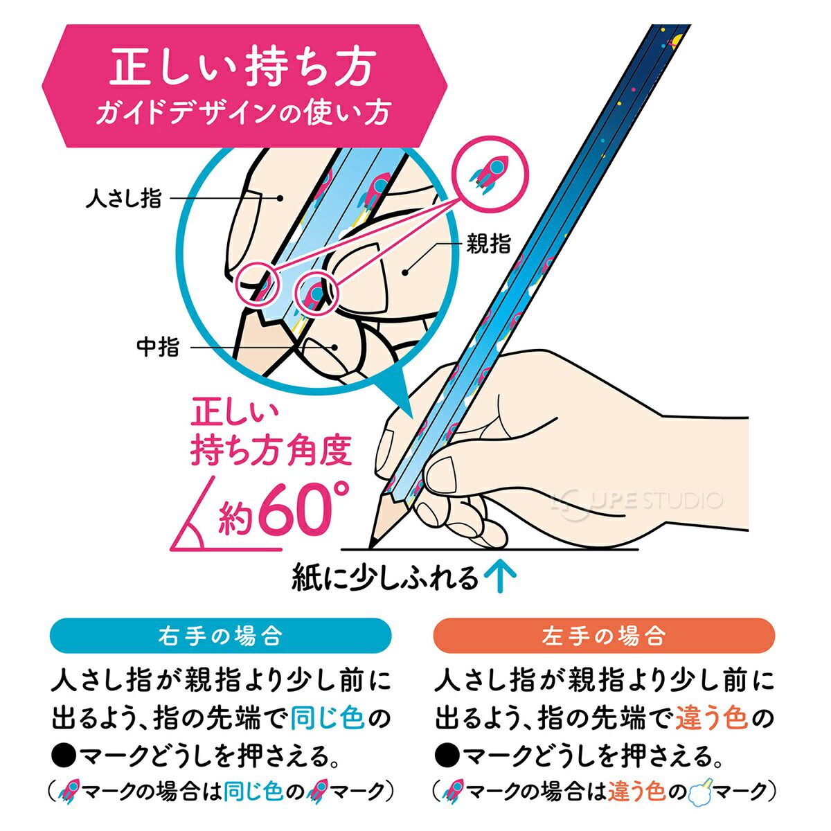 這款鉛筆相當貼心,讓左右手都能掌握正確握筆姿勢呦!筆面上的火箭圖案可以方便確認指尖的位置,讓寶貝更快學會書寫。