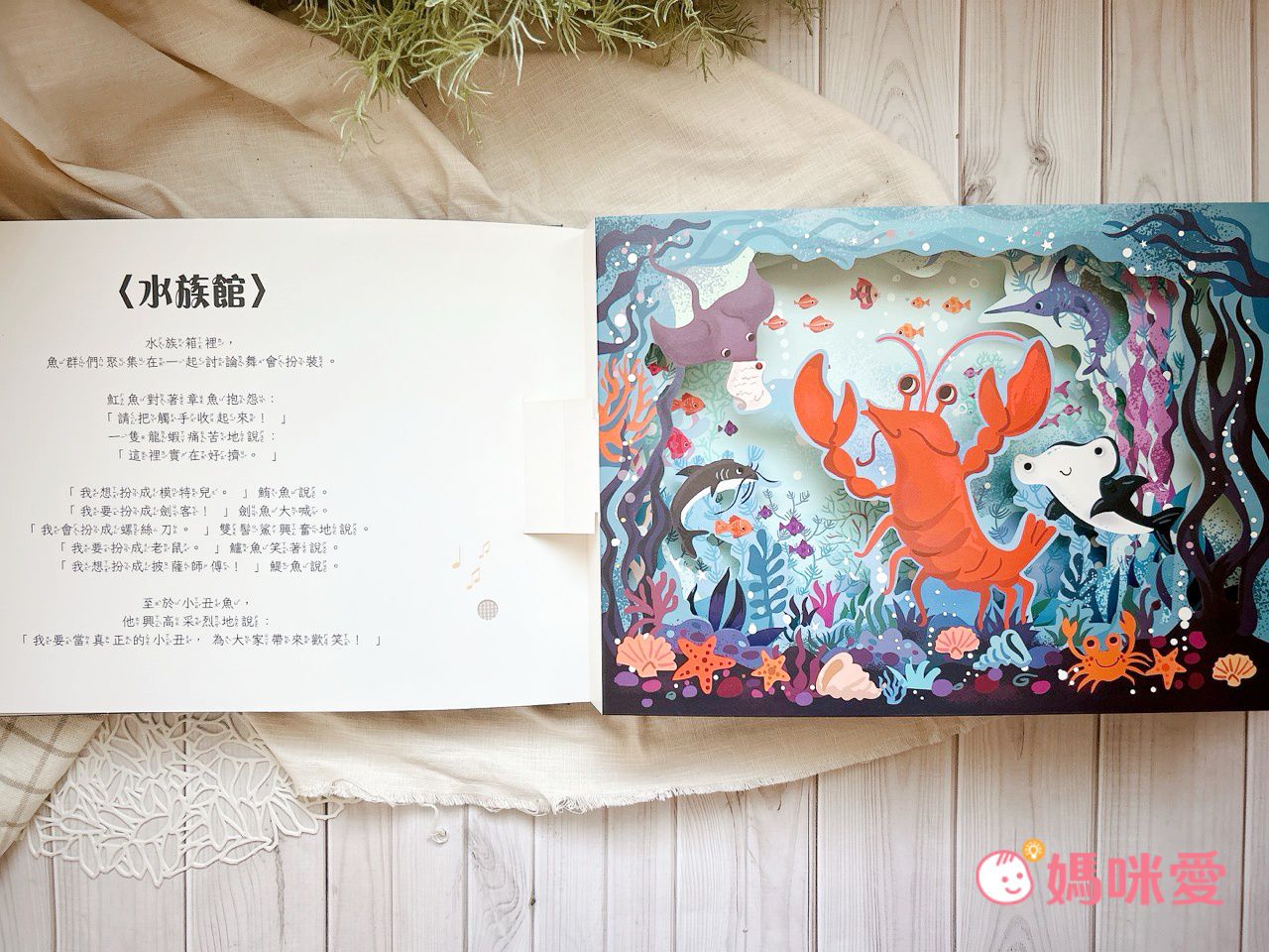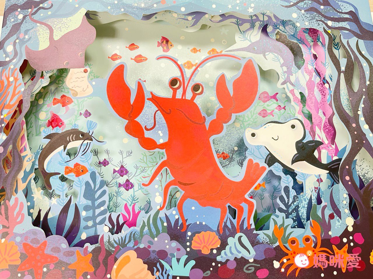 這頁的紙雕是弟弟王紅最愛的一頁,顏色繽紛又充滿海洋生物,整體看起來生動有趣!