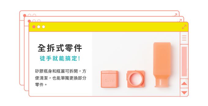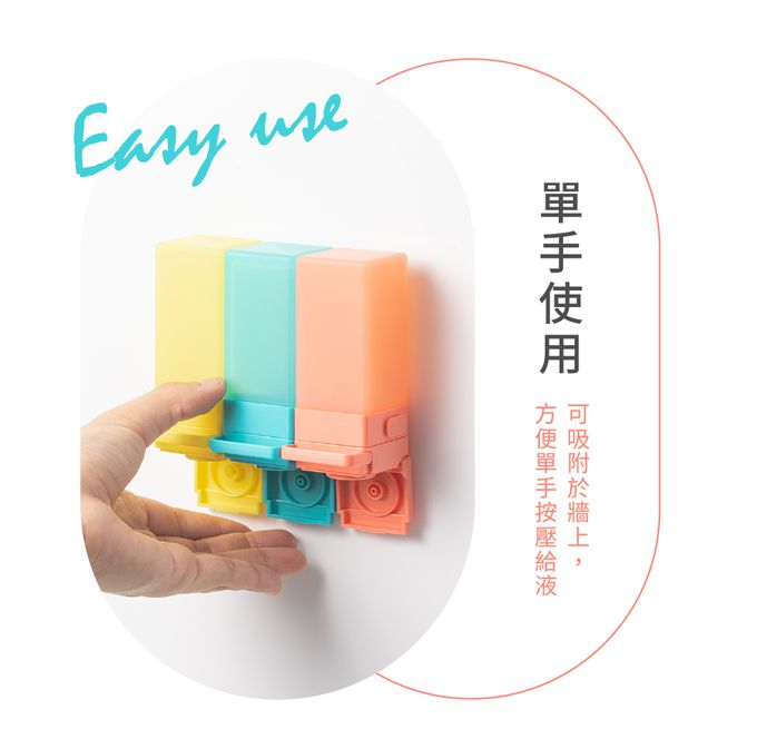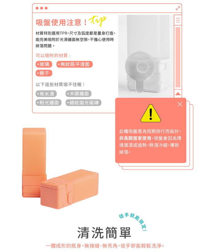 注意事項:1. 請勿放在小孩附近,避免誤食。 2. 第一次使用請先清洗乾淨。 3. 吸盤為輔助設計,可視需求使用。 4. 使用後請清洗乾淨,避免染色。 5. 遠離尖銳物以免破壞瓶身。 6. 請勿裝填食用油、按摩油、卸妝油。