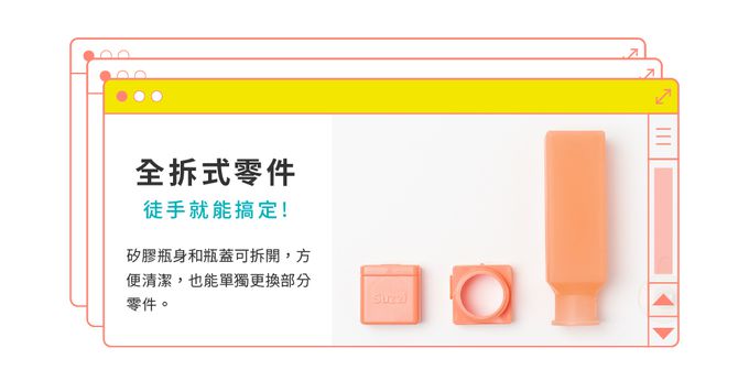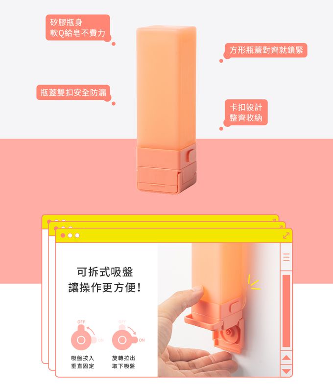 注意事項:1. 請勿放在小孩附近,避免誤食。 2. 第一次使用請先清洗乾淨。 3. 吸盤為輔助設計,可視需求使用。 4. 使用後請清洗乾淨,避免染色。 5. 遠離尖銳物以免破壞瓶身。 6. 請勿裝填食用油、按摩油、卸妝油。