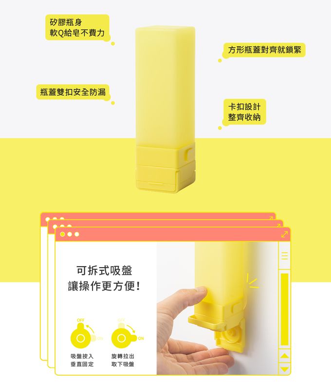 注意事項:1. 請勿放在小孩附近,避免誤食。 2. 第一次使用請先清洗乾淨。 3. 吸盤為輔助設計,可視需求使用。 4. 使用後請清洗乾淨,避免染色。 5. 遠離尖銳物以免破壞瓶身。 6. 請勿裝填食用油、按摩油、卸妝油。