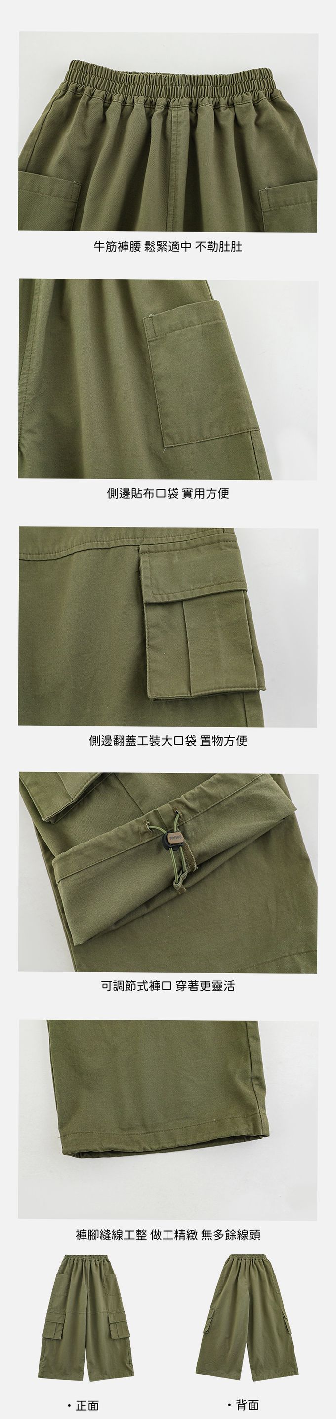 純棉休閒大口袋工裝長褲-下擺可調節-軍綠色