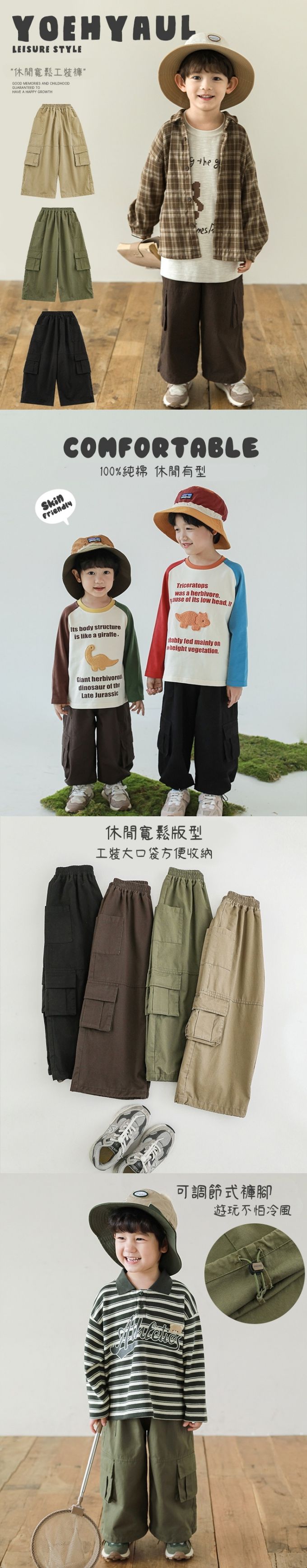 純棉休閒大口袋工裝長褲-下擺可調節-卡其色