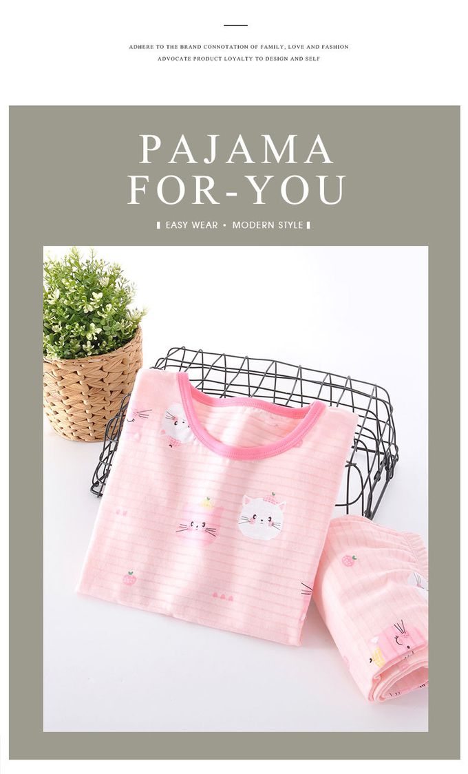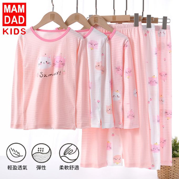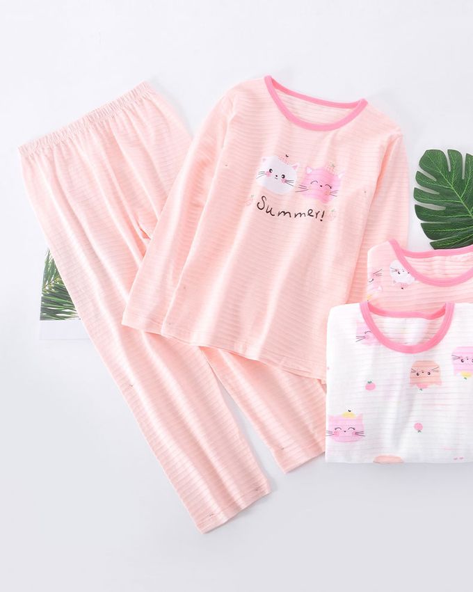 竹節棉圓領長袖套裝/家居服-滿版貓咪-白色