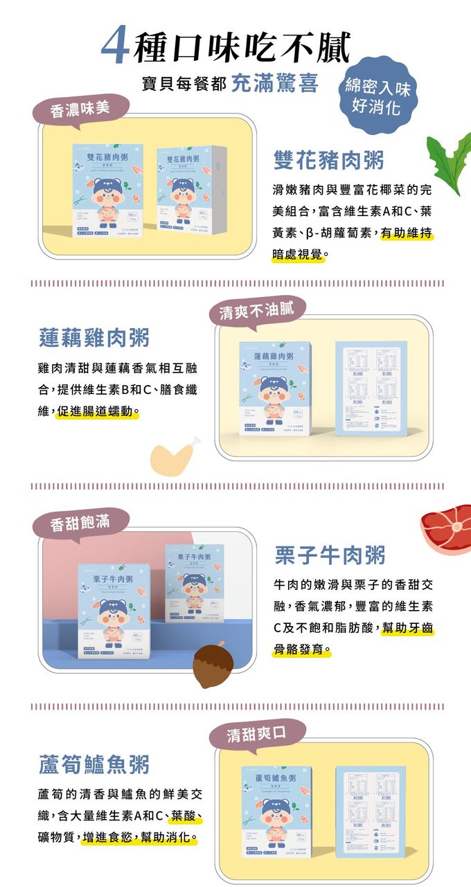品名:寶寶粥 4入/盒 (雙花豬肉粥/蓮藕雞肉粥/栗子牛肉粥/蘆筍鱸魚粥)-效期至25.6.20
