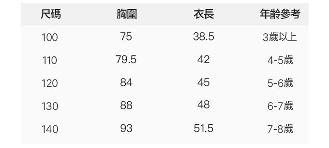 2. 尺寸表乃依平均值制定,每位孩童發育情形不同,請參考模特試穿資訊、既有衣物等,並依實際測量結果為準。3. 第一次穿之前,建議單獨手洗。