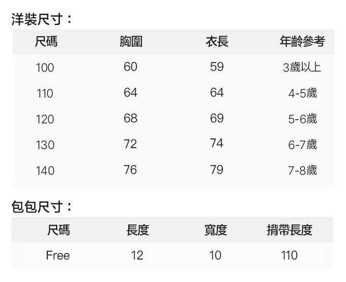 2. 尺寸表乃依平均值制定,每位孩童發育情形不同,請參考模特試穿資訊、既有衣物等,並依實際測量結果為準。3. 第一次穿之前,建議單獨手洗。