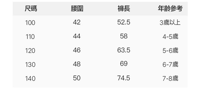 2. 尺寸表乃依平均值制定,每位孩童發育情形不同,請參考模特試穿資訊、既有衣物等,並依實際測量結果為準。3. 第一次穿之前,建議單獨手洗。