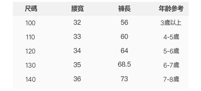 2. 尺寸表乃依平均值制定,每位孩童發育情形不同,請參考模特試穿資訊、既有衣物等,並依實際測量結果為準。3. 第一次穿之前,建議單獨手洗。