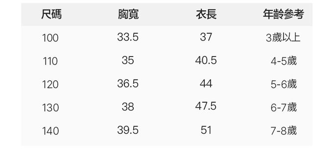 2. 尺寸表乃依平均值制定,每位孩童發育情形不同,請參考模特試穿資訊、既有衣物等,並依實際測量結果為準。3. 第一次穿之前,建議單獨手洗。