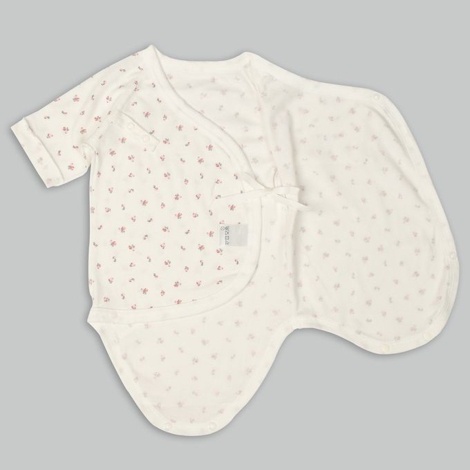 套組商品中包括一款包裹小寶寶的交叉式設計連身衣。