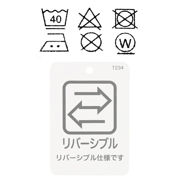 • 注意事項:●標示內容遵照台灣法規之規定。●請使用不含螢光增白劑的洗劑。●請勿熨燙釦子部分。●熨燙請使用墊布。●(因是正反兩面皆可使用,所以)洗滌標並未縫製牢固。若洗滌標脫落的話,請妥善保存。