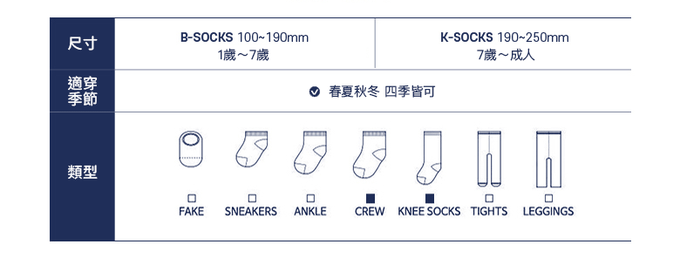 • 從新生兒到男性成人,僅有3種尺寸,買襪子不需要再看著尺寸表煩惱!