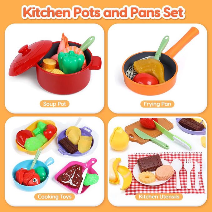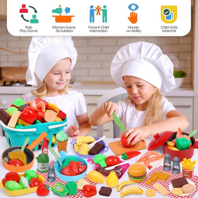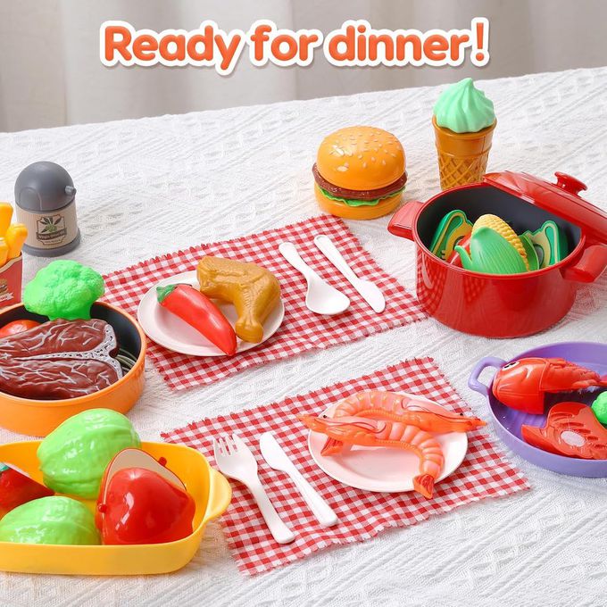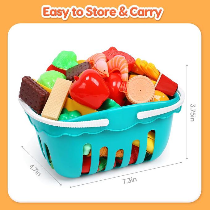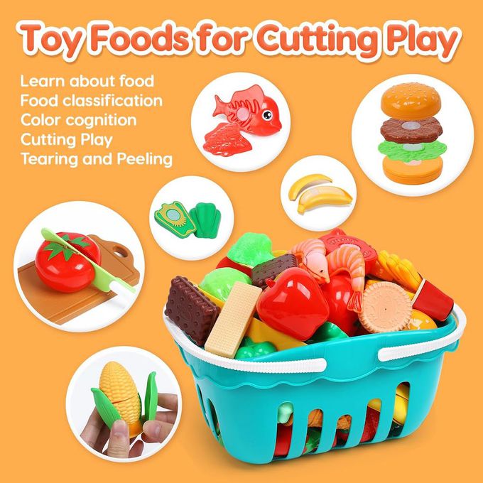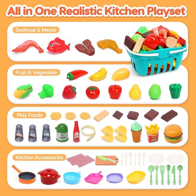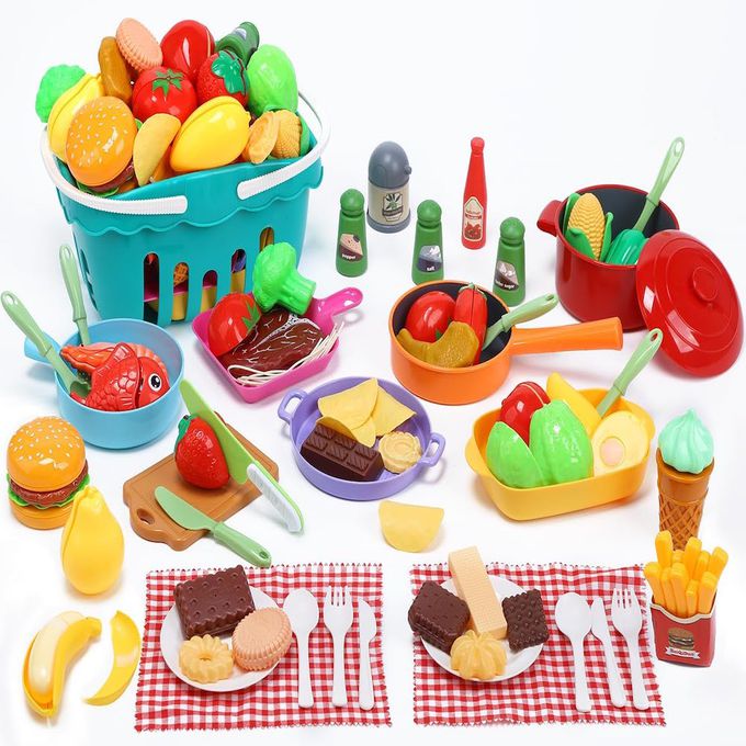 品名:兒童仿真鍋具與西餐切切樂收納提籃套裝玩具60件組