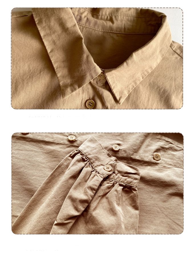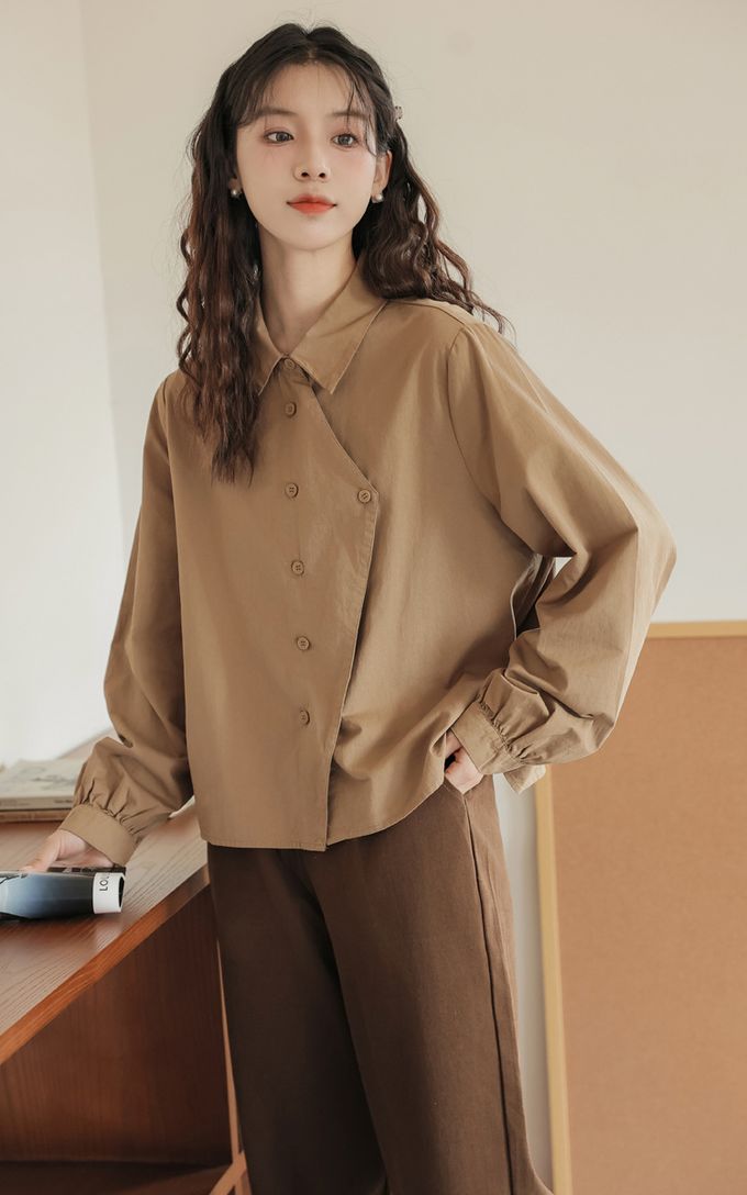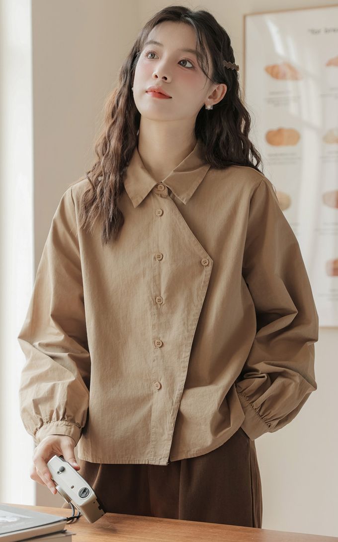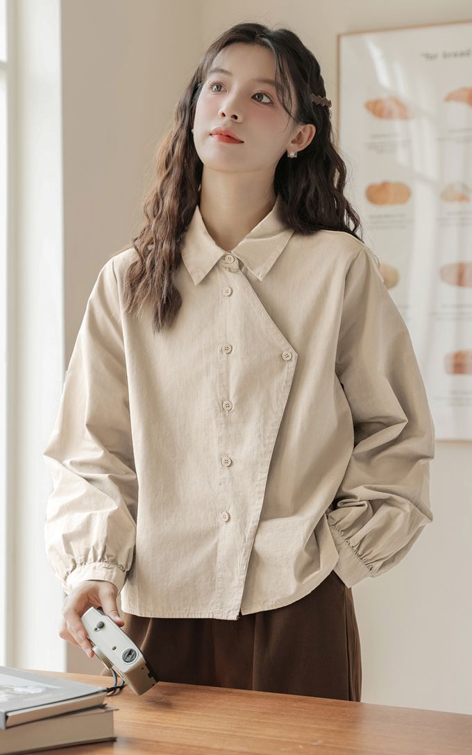 設計感不規則單排釦長袖襯衫-杏色