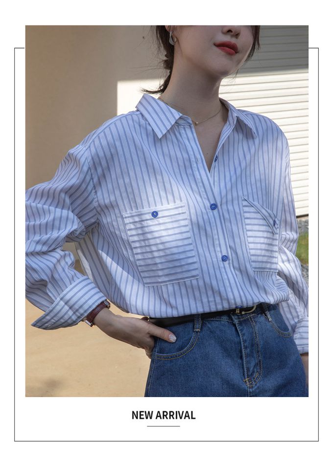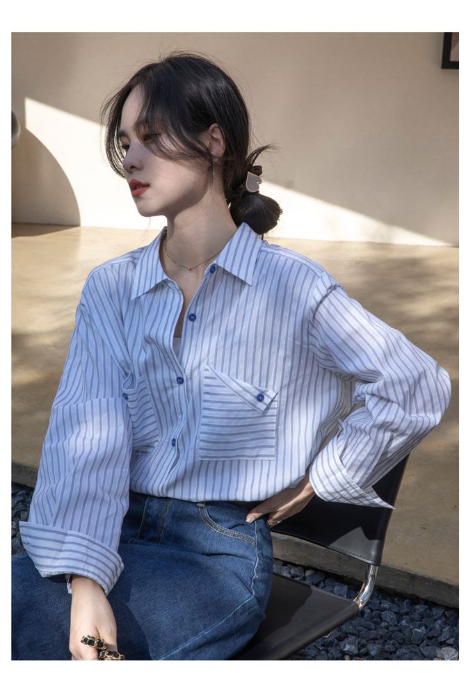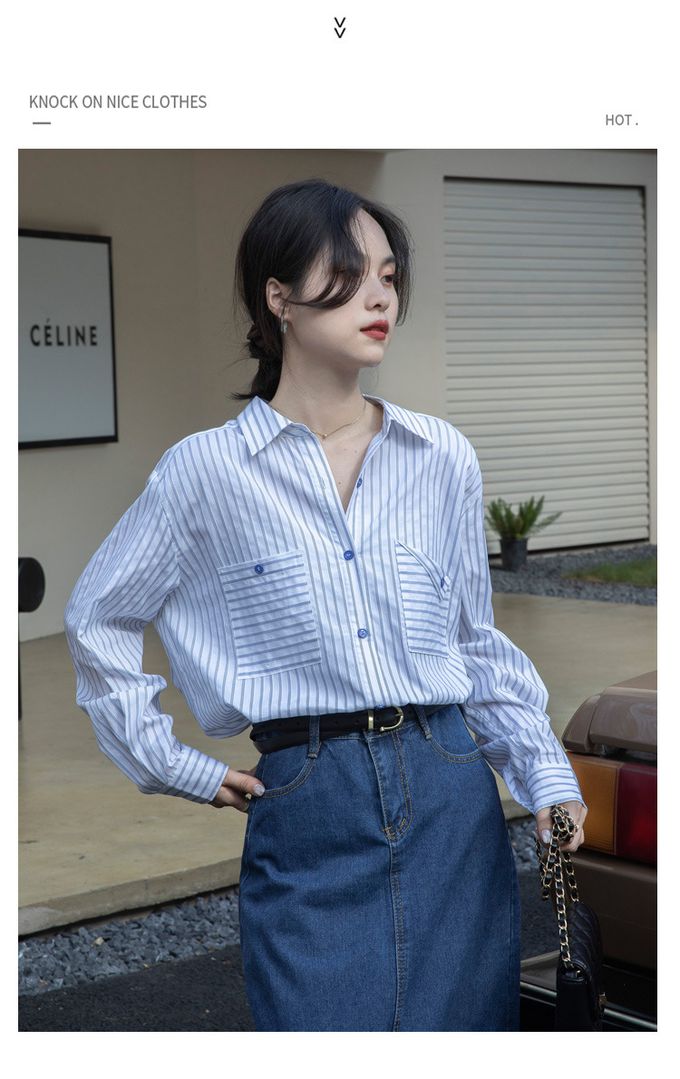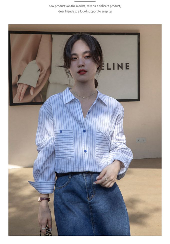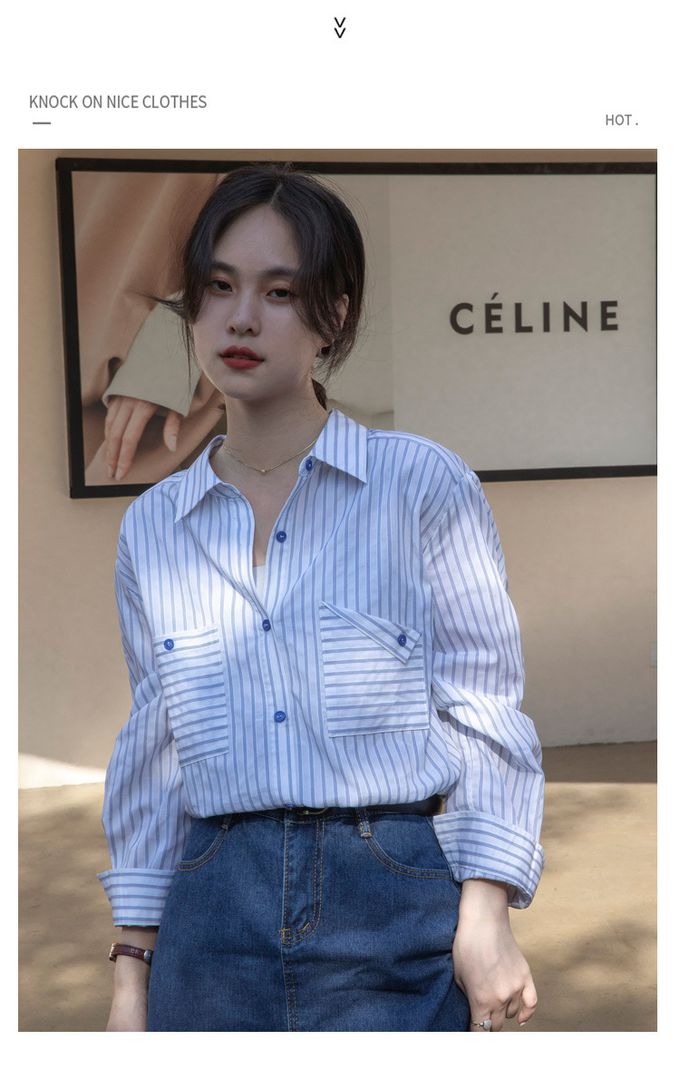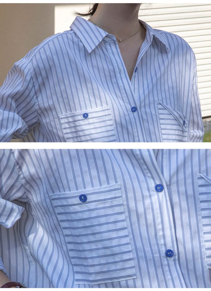 設計感不規則口袋微寬鬆長袖襯衫-藍白條紋