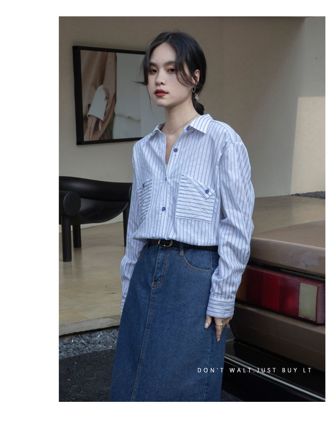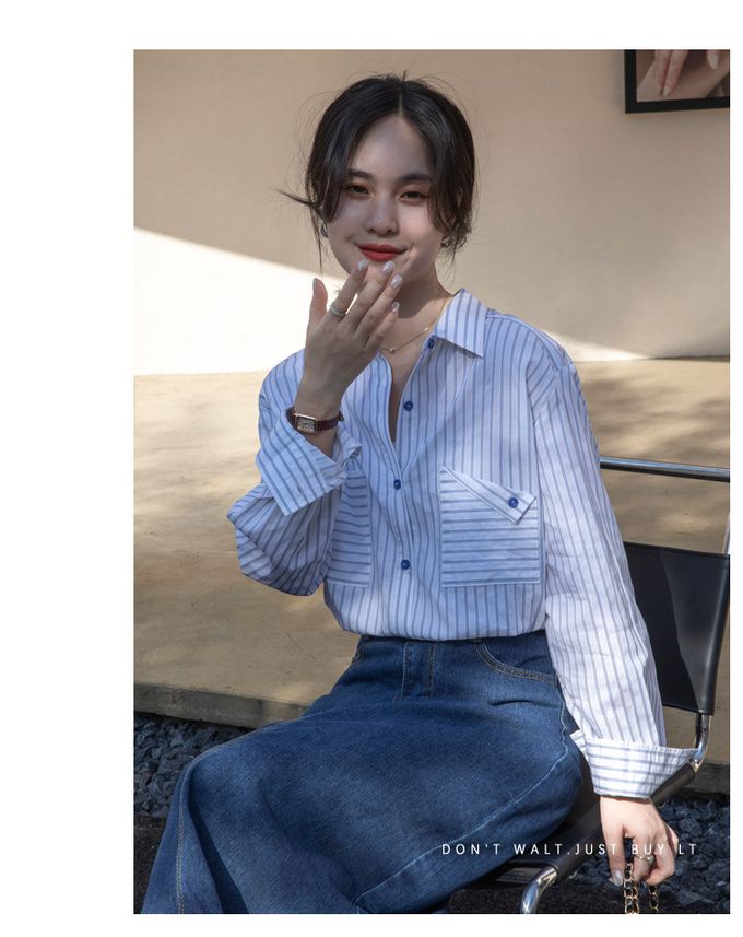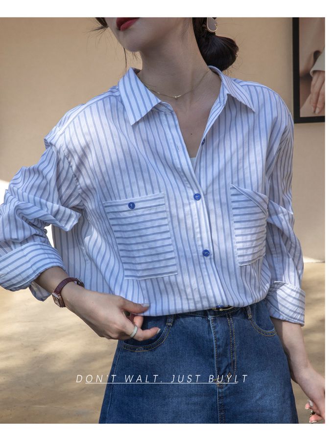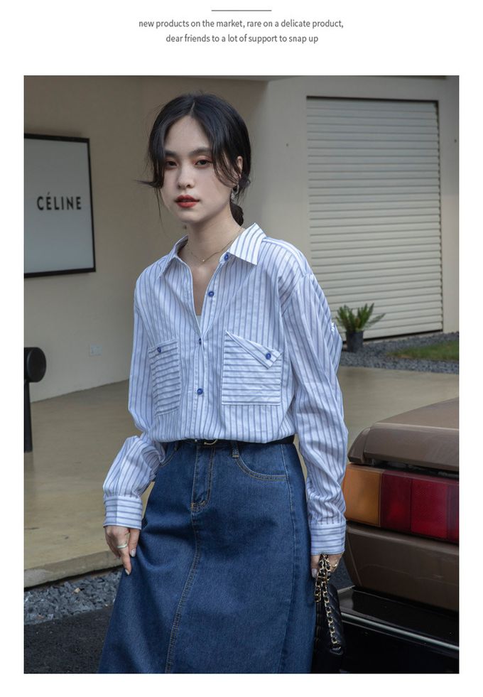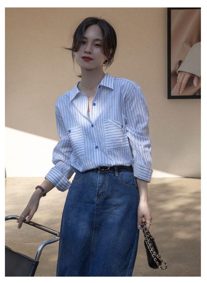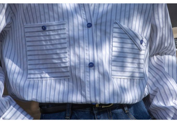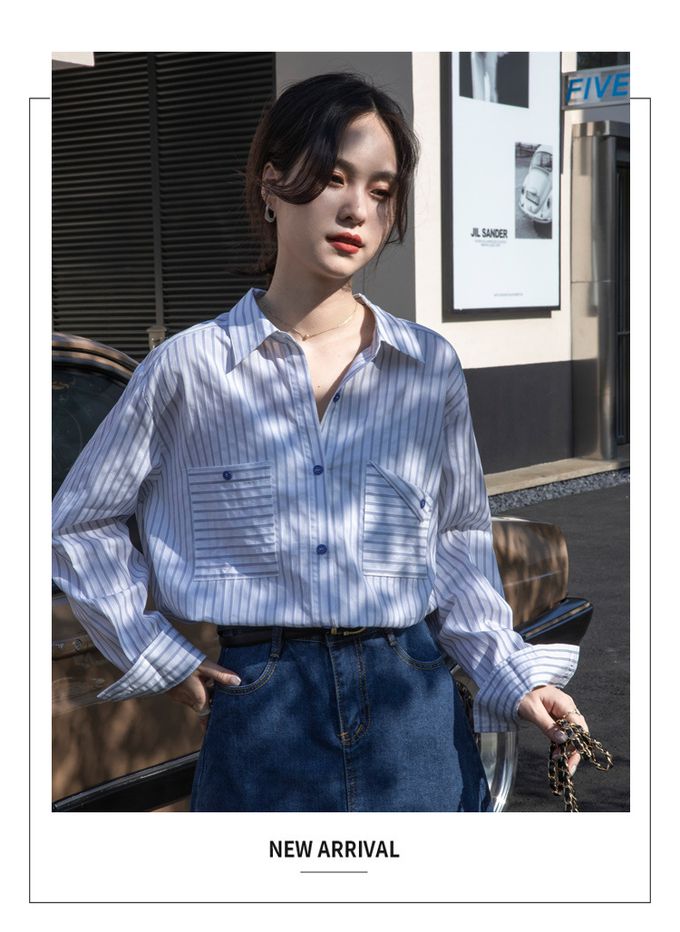 設計感不規則口袋微寬鬆長袖襯衫-藍白條紋