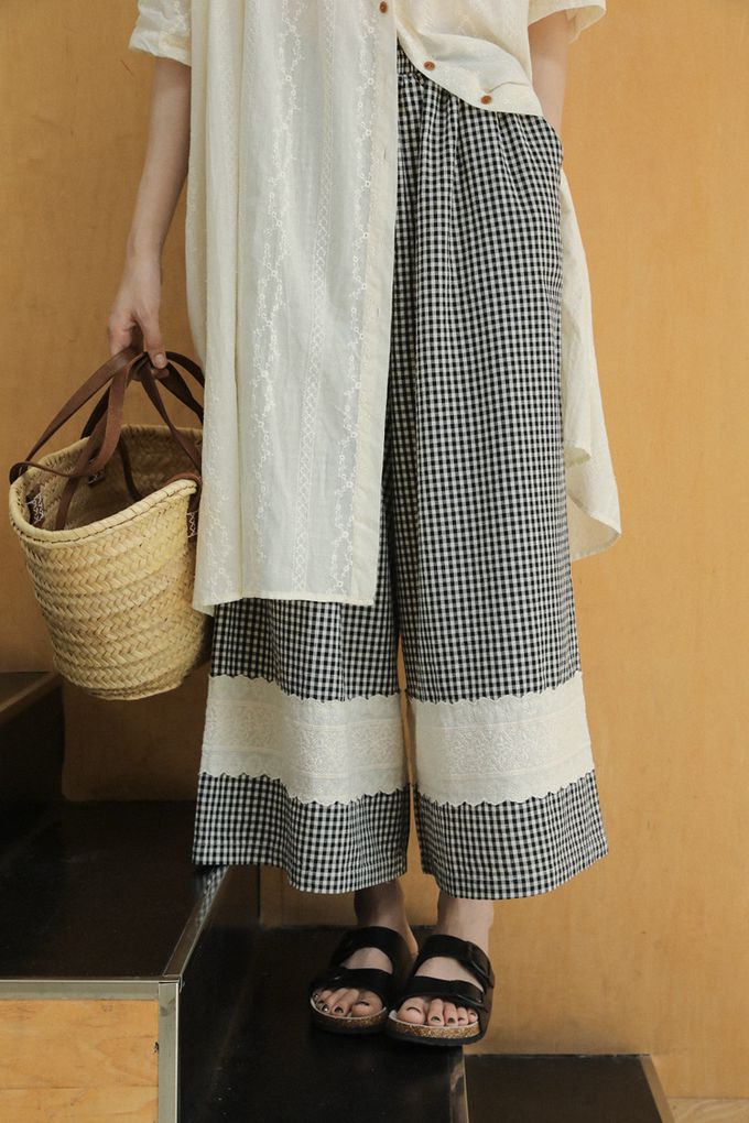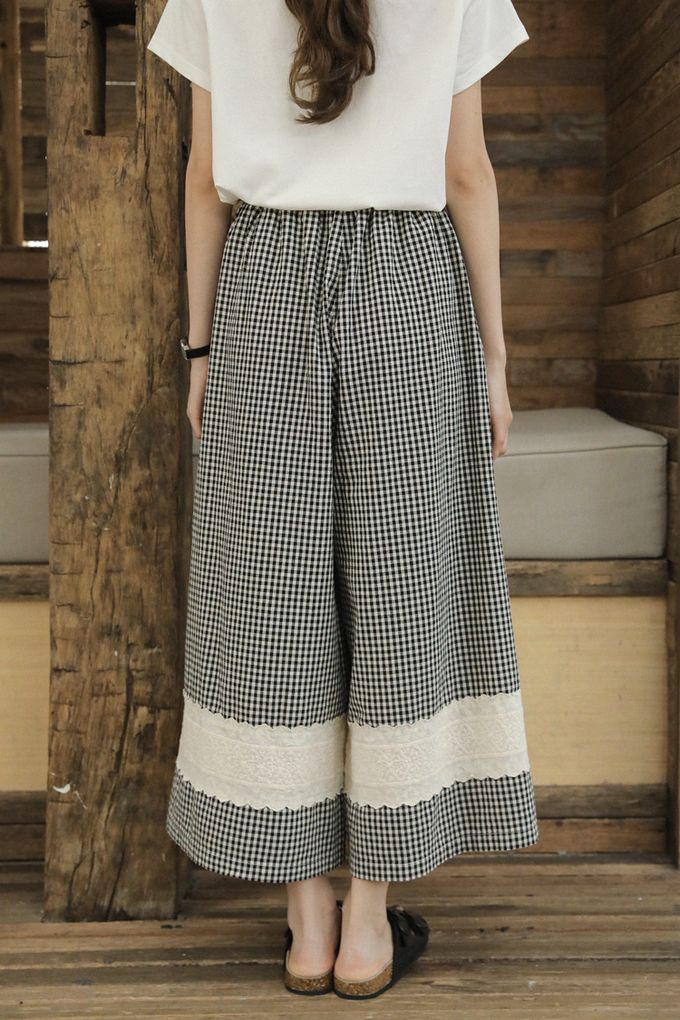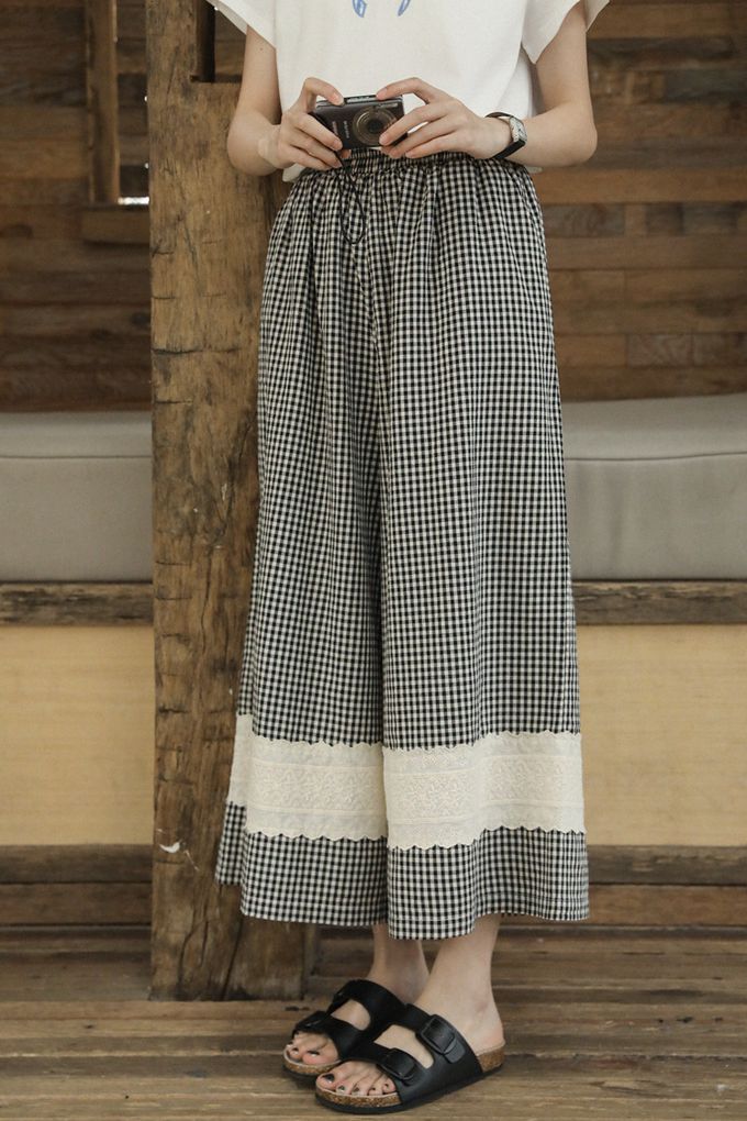 LANJÍN - 日系小清新少女蕾絲拼接寬褲-黑白格 (F)