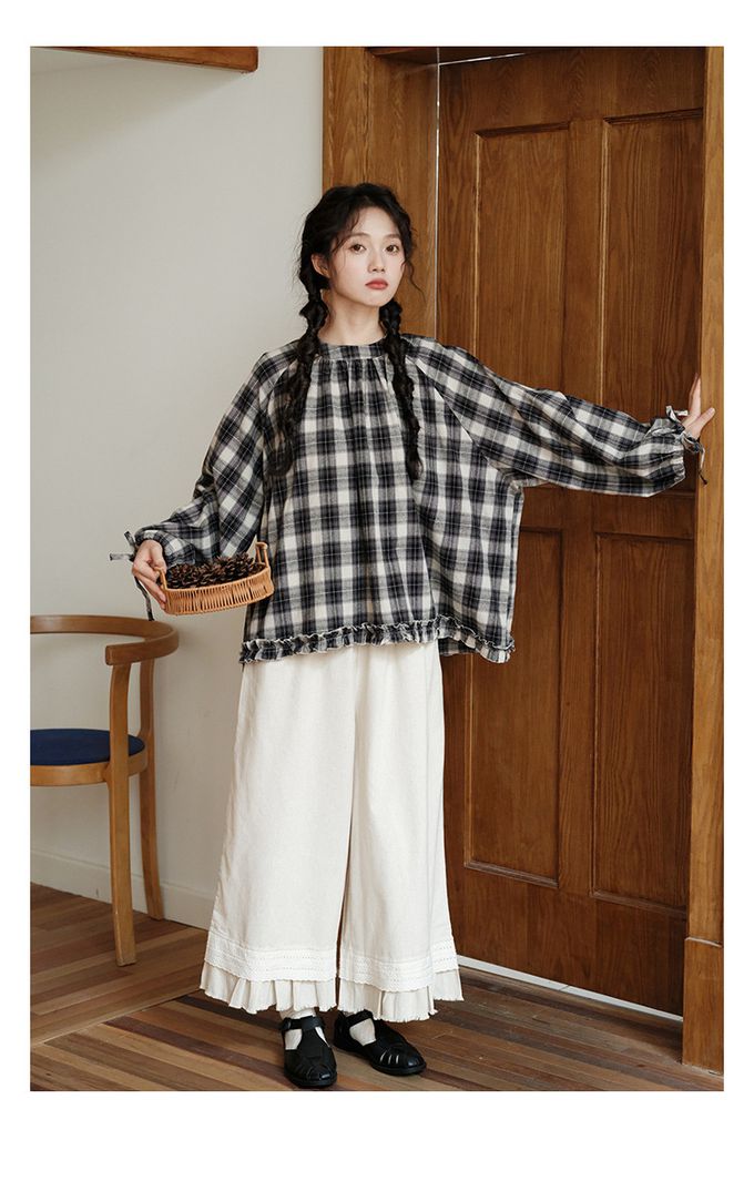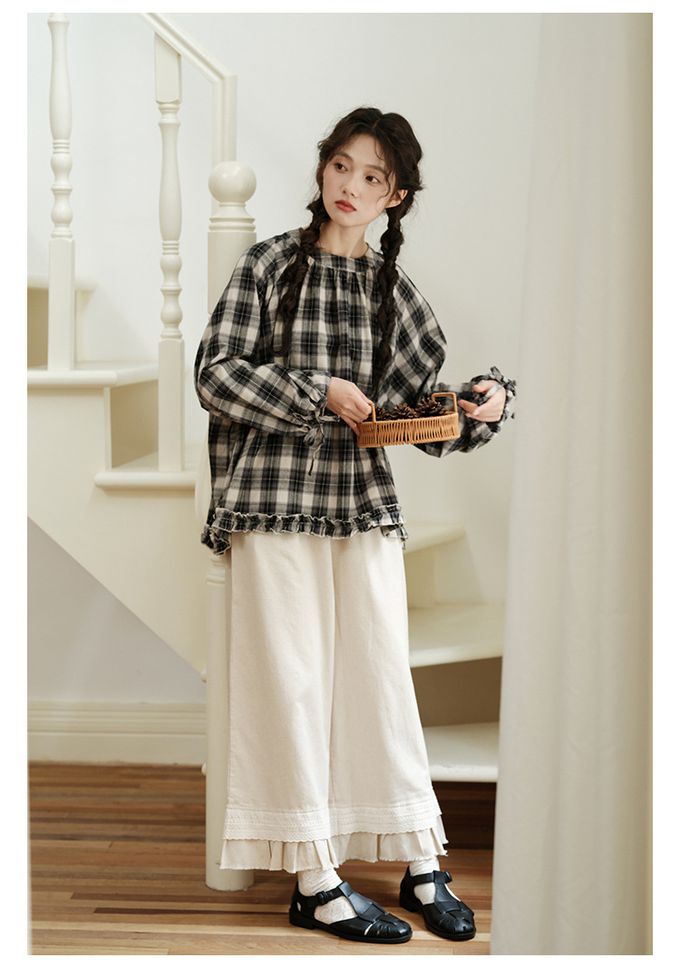 品名:日系文藝森林花邊休閒九分寬褲
